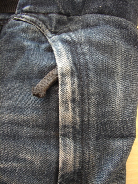 Die vorliegende Hose weißt speziell im Bereich der Taschen einen erhöhten Farbabtrag auf. Dies resultiert neben der häufigen Nutzung der Taschen insbesondere aus der Nutzung bei feuchter Witterung oder starkem Schwitzen (Hände). (Die Hosen Saum war sogar noch feucht als ich diese in der NL München begutachtet habe.)