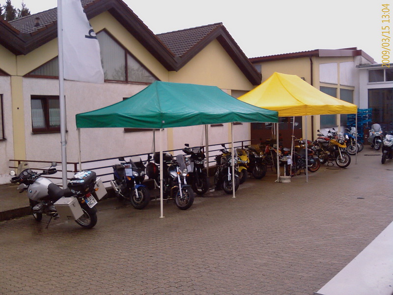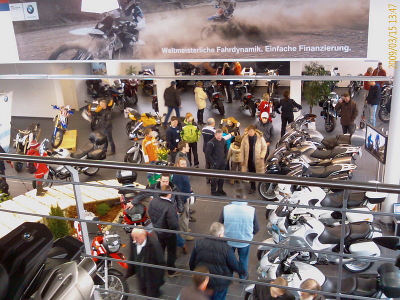 war ja irgendwie klar, gestern war ich mit dem Automobil unterwegs ((gezwungenermassen)) und es war warm, sonnig, leichte Brise, ein Fruehlingstag eben. Heute mit dem Krad auf Tour und prompt schifft es den lieben langen Tag. Die wenigen Minuten ohne Regen, dafuer diesig, bedeckt und trueb, kann man an einer Hand abzaehlen. Aber was solls, BMW Maier in Neufinsing musste seinen Glaspalast eroeffnen und zu diesem Behufe waren wir also angereist. Ich frage mich wirklich warum es aktuell nur 2 Sorten BMW Haendler gibt. Die einen sperren nach Jahrzehnten treuer Dienstbarkeit sang- und klanglos den Laden zu ((wie Wuedo)) und die anderen bauen sich einen Glasbaukasten nach BMW Vorbild und zelebrieren „Saisoneroeffnungen“ und „Hausmessen“.