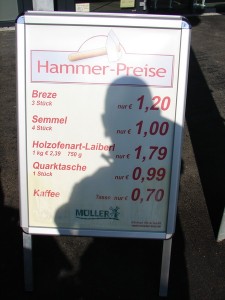 Bis wir endlich in Unterammergau waren (man ahnt wohin die Reise fuehrt) fuhren wir teilweise mit Sicht unter 10 Meter, eine Suppe vom feinsten. Es wurde dann klarer, zunehmend heller, richtig sonnig sogar. Nur kuehl blieb es, die famose Idee direkt beim naechsten Backshop a) aufzuwaermen und 2) Heissgetraenk zu trinken, wurde freudig mit 4:0 angenommen und Punkt 10:53h stehen wir im Mueller Baecker in Oberammergau. Zu meiner Verwunderung und noch groesserem Aerger wurde ueberhaupt kein Kaffee angeboten denn „die Kollegin hat die Maschine schon sauber gemacht“. Tolle Nummer Ladies, ich wette nen Hammer haett ich auch nicht bekommen wenn ich denn einen gewollt haette.