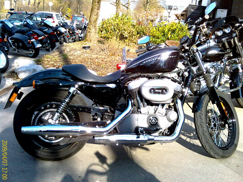 sicher nicht. Nicht das ich nicht sehr neugierig war, wie sich so ein Eisenhaufen aus Milwaukee wohl faehrt, aber Mitglied im HOG ((Harley Owners Group)) werde ich sicher nicht mehr in diesem Leben. Das Geruempel Gefaehrt schimpft sich uebrigens Harley Davidson Sportster Nightster und wartet mit umgerechnet 1200 ccm und 2 Zylindern auf. Ein Geschuettel und Gerumpel wenn man am Lautstaerkeregler rumspielt, das einem Angst und Bange werden kann. Zu diesem Vergnuegen, also das bewegen einer solchen Nightster, kam ich durch einen guten Spezl, der sich so ein Trum eingebildet hat und wenigstens auf den Rat hoerte, er moege doch erst mal Probefahren mit dem Haufen Ding. Mit seinem gut 1,85 m war da aber kein Blumenpott zu gewinnen auf dem Teil, die Knie an den Ohren und die Arme ewig angewinkelt, das ist kein entspanntes Fahren.