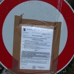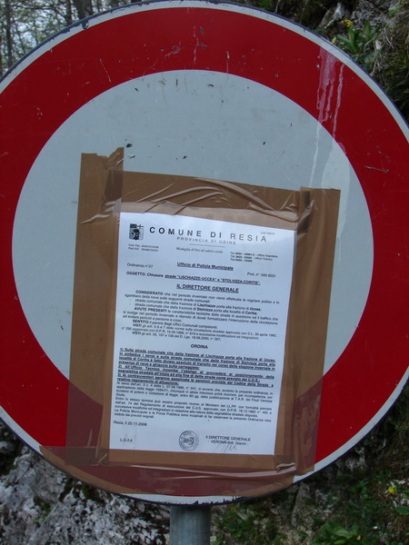 In Spodnja Zaga geht es auf den Ucja Pass, der auf der Strada Comunale Resia-Uccea ((SS646)) verlaeuft. Am Beginn stossen wir auf ein Schild, Einfahrt verboten. Jedoch ueberklebt mit einem wichtigen ((vermutlich)) Dokument des Generali sowieso von haudaneben. Irgendwas mit „nicht fahren“ und „Schnee“ laesst sich herauslesen. Ich kombiniere einfach mal ein „nicht bei Schneefall oder Schnee fahren“.