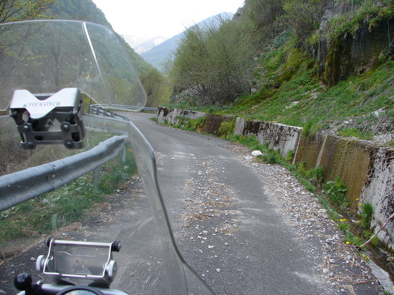 Single-Track-Road. Ueberall liegen Steinbrocken in der Groessenordung Tennisball bis Kindskopf. Nach ein paar Kilometern, die nicht ohne waren, kommt uns eine kleine rote Vespa entgegen. Mehr Rost als rot und darauf ein freundlicher aelterer Italiener, der uns eindringlich davor warnt weiter zu fahren. Es sei alles voller Schnee und Geroell und man koenne nur mit einer Trialmaschine ((ok er sagte „Trihhh-Aal“ aber wir wissen was gemeint ist)) darueber fahren. Ausserdem stuende ihm nun ein 2 stuendiger Umweg mit seiner Wespe bevor, denn diese Abkuerzung nimmt er sonst immer ((im Sommer)). Ok, bis hierhin war es aber sehr geil. Also belassen wir es dabei.