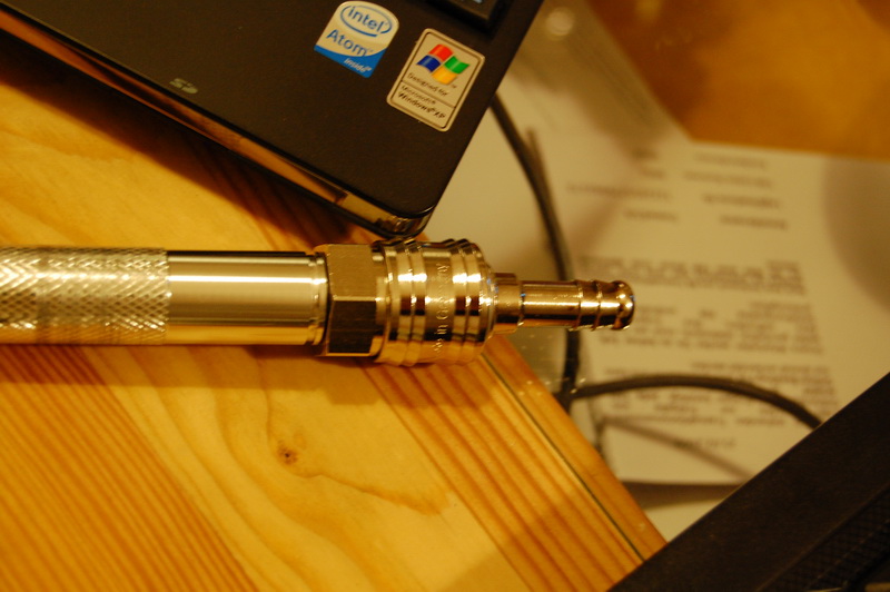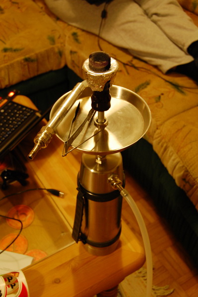 ein Jahr nach meiner Bestellung ((MF2008)) war am letzten Wochenende die feierliche Uebergabe ((wie vereinbart)) und heute die Einrauchungweihung. Ein Cola/Zitrone Mix aus dem Kuehlschrank qualmt nun aus der ehemaligen Thermoskanne, die vermittels allerlei Adapter, Dichtungen und Silikonschlauch zu einer Reiseshisha mit Nehmerqualitaeten gepimpt wurde. Heissen Dank fuer das schicke Teil an Joerch_. Genug geschrieben .. Shisha schmauchen.