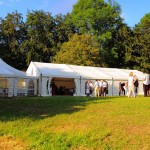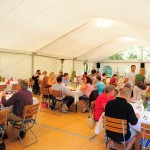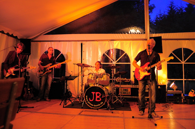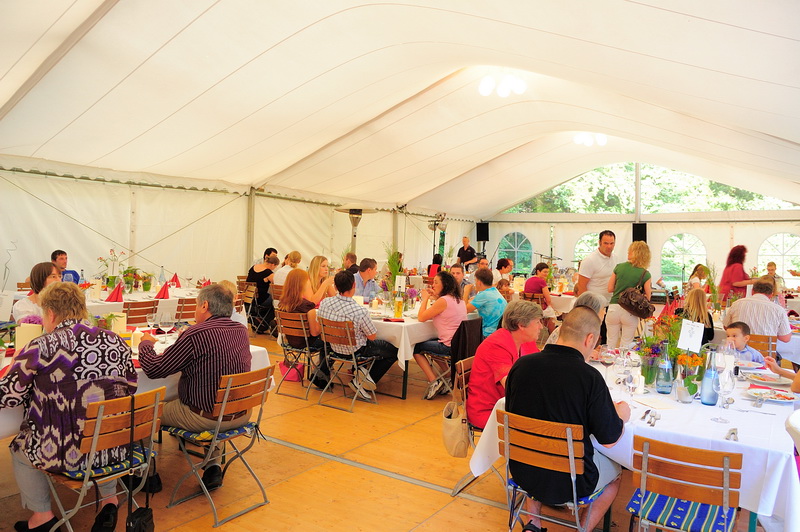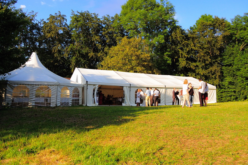 Uns erwartet auf der schwaebischen Alb am Harpprechtshaus ein weisses Zelt mit geschaetzten 100 geladenen Gaesten und einem halben Dutzend Personal, die gar nicht recht nachkamen, Schorlen, Biere, Kaffee, Tee, Schnaepse und derlei mehr heran zu schaffen. Das Brautpaar hat es an nichts mangeln lassen, die Menukarte ein Traum und ich habe in weiser Voraussicht beim Vorspeisenbueffet nicht zu viel gegessen, so dass ich diverse Lendchen an Roastbeef auf einem Spaetzlespiegel in Sosse satt vertilgen konnte. Sehr lecker. Den Abend ueber spielte ein Band auf, wobei der Saenger leider Down Under sehr frei interpretierte und bei einem R.E.M Lied ((dessen Titel mir schon wieder nicht einfaellt .. Documents?)) wars mit der Melodie nicht so gluecklich. Insgesamt aber sehr geil. Als wir gegen 01:30h von der Festivitaet in die nebenan bereitstehenden Doppelzimmer wechselten ahnte ich noch nicht, dass die lustige Truppe unten noch bis zum Sonnenaufgang feiert. Akkustisch war ich dabei. 😉