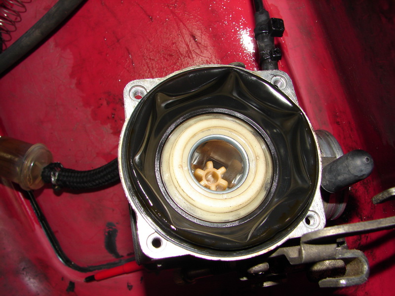 Und nun stehe ich da und warte darauf, dass sich die Membrane wieder trocknet, damit ich sie in den Vergaser zurueckgebastelt bekomme. Mal sehen was als naechstes auseinandergerissen werden muss.