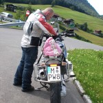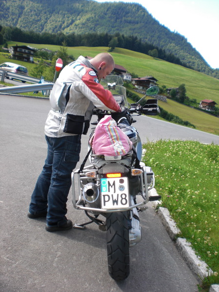 Der kurze Wortwechsel vor der Abfahrt passt nun nicht ganz zu meiner Tankanzeige und die Restreichweitenvorhersage ((die im allgemeinen verflixt genau ist)) mahnt zum Sprit fassen. Navi konsultiert, grob die Position der vermuteten Tanke eingeben und vorsichtiger als eingangs weiter. Die Tanke ist uebrigens nicht gleich hinter Landl, sie ist gleich hinter Thiersee und so kommt es, dass ich mit 8 km Restreichweite und nachzutankenden 19,40 Litern sage und schreibe 372,3 km gefahren bin ((5,21 l/100km)). Heiliger St. Hudelfeld, feine Sache das. Auch fein ist der Metzeler Tourance EXP. Das ungewohnt heftige „Einkippen“ bei Kurven ist entweder massiv weniger geworden oder ich merke es nicht mehr. Auf jeden Fall klebt der recht anstaendig und wird in die Liste der „die fahre ich mal wieder“-Reifen aufgenommen. Beim abendlichen Riesenschnitzel essen wurde dann nochmal das KNACK besprochen, damit die Kinderseele keinen selbigen kriegt ((wir sind einem toten Marder voll ueber die Ruebe gefahren und das knackst ordentlich)). Die grosse Peinlichkeit des Schiebens bis zur Tanke wurde also dank universeller goettlicher Hilfe des Schutzpatrons der Kradfahrer zum Tatzelwurm abgewendet.
