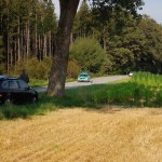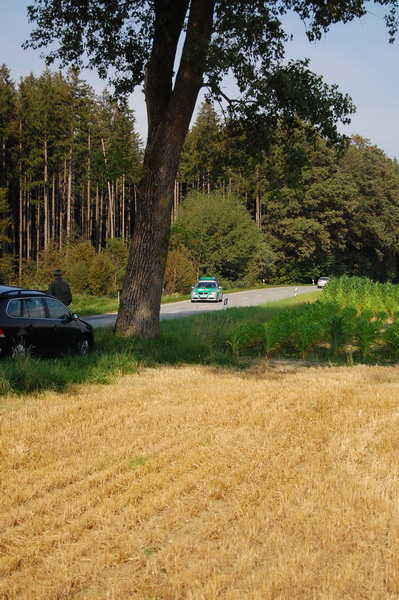 das kleine weiss-gruene Auto auf dem ersten Bild, das ist ein Pozileiauto. Ich bin gerade von meiner Exkursion durch den Acker und rum um das Maisfeld wiedergekommen und begruesse die Beamten, die mir beim Helm abnehmen zusehen freundlich. Ich teile mit, ich bin eben hier den Acker runtergefahren, also von der Landstrasse durch das Gruenzeug, dann den Acker runter bis zum Ende, dort am Maisfeld entlang in einer Treckerspur und durch die Rueben auf der anderen Seite wieder hoch zur Strasse. „Und dann?“ fragt die junge ((nicht ganz haessliche)) Pozilistin, „Dann, bin ich wieder da vorne ((Finger zeigt in die Richtung der umgepfluegten Grasnarbe)) rein auf den Acker und hab Runden um die Heuballen gedreht.“ „Gut“ sagt der Pozileibeamte der das mitanhoerte. Von weitem hoert man auch schon das Heulen der Sirene, der Rettungswagen ist gleich da.