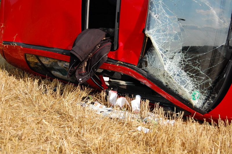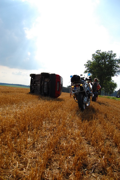 Nein, ich habe mich nicht abgelegt und wegen mir musste auch keiner die Gendarmerie auf den Plan rufen. Auf der Heimfahrt von Stuttgart, die wir fast ausschliesslich per Kreisstrasse und Staatsstrassen absolvierten, kamen wir auf der St2051 kurz vor Höfa an einem Acker vorbei, auf dem 10 m von der Strasse ein roter Golf auf der Seite lag und leidlich demoliert aussah. Kein Fahrer, kein Blut, keine Pozilisten oder Sanka? Aha, abgehauen, Schock, Suff oder beides. Also den Acker abgefahren, um das naechste Feld und wieder retour um zu sehen was man doch noch Brauchbares im Golf findet ((Armbanduhr, Kontoauszuege, Jacken, jedoch keine Papiere)). Der Motor war noch heiss, der Auspuff auch, Zuendung war noch an, ist also grade passiert. Zuendung habe ich ausgemacht, weil prompt ein Schaulustiger meinte „nicht so nah ran, wenn der in die Luft fliegt“. Die Leute sollten weniger Cobra14 oder wie der Kack heisst, ansehen. Da fliegt einfach so gar nichts in die Luft.