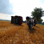 Tja. Der Fahrer samt Kompagnon hat sich anscheinend ((soviel habe ich noch mitbekommen, bevor wir endlich weiterfahren konnten)) im Schock ((oder doch Rausch?)) von einem vorbeifahrenden PKW mitnehmen lassen und wollte nur noch heim. Der Mitnehmende hat im ersten Moment auch nicht realisiert, dass hier ein ziemlicher Unfall mit Ueberschlag stattfand und nahm sie einfach mal mit. Die Herren ((und die Dame natuerlich)) in gruen werden das schon aufklaeren … irgendwie. Tja, so habe ich also ein grosses Lob ((zur Verabschiedung)) kassiert, dass ich so spontan in den Acker bin um zu suchen und ggf. zu helfen. Tja, Endurofahren ist quasi Leben retten. Oder so.