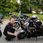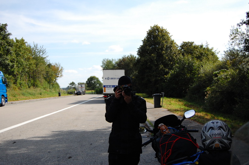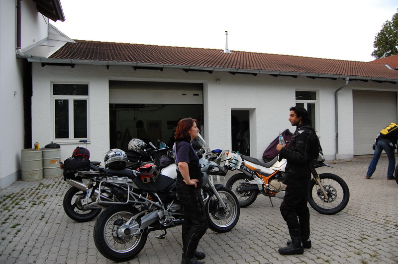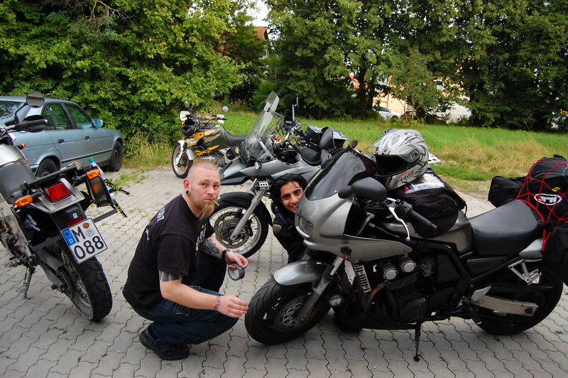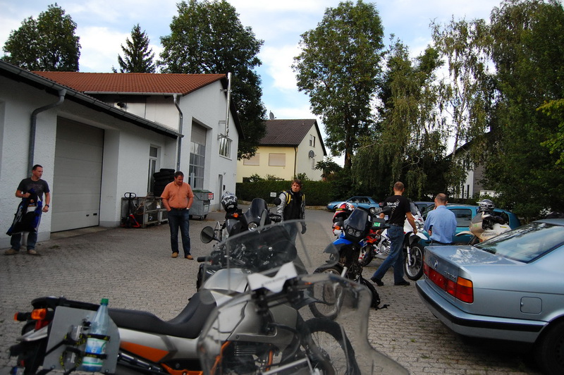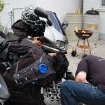 spruchte ich, als ich heute Nachmittag einen Bekannten auf einem Autobahnrastplatz aufgabelte und ihm sein Erste Hilfe Kit uebergab ((welches die Maschinenbaeuerin fuer ihn besorgte, wegen der Oesterreichdurchfahrt)). Er ist auf einem „Kurzausflug“ nach Kaernten. Kurz ist allerdings nur die zur Verfuegung stehende Zeit, die Distanz ist London – Klagenfurt. Da er es in einem Rutsch fahren will um seine Angebete zu sehen ((wofuer ich vollstes Verstaendnis habe)), bot ich an im Raum Muenchen fuer Speis, Trank, kurzes Nickerchen ((wollte er aber dann doch nicht)) und eventuelle Gefallen, zur Verfuegung zu stehen. Nach einer guten Tasse Tee, einer Dusche und einem Schwarzbrot mit Schinken ((wer so wenig isst, darf oefter kommen)) sollte es dann weitergehen .. und hier kommt die Kategorie „Fremdgebastel“ ins Spiel. Das Kettenspray, welches man sehr gerne an ihn weitergab, sollte auf eine Fazerkette mit 10 cm Durchhang gesprueht werden. Spruehen auf dem Seitenstaender, da der Hauptstaender gerade eines Bolzens verlustig ging ((Sachen gibts)). Also wurde Beschluss gefasst, dass wir erst mal in die Werkstatt fahren ((also unsere Bastelbude, sind ja nur 15 km oder so)). Dort wurde dann sowohl Hauptstaender befestigt als auch Kette ordentlich gespannt. Passenderweise wollte gerade die Affentwintruppe die Werkstatt fuer den Grillabend herrichten, so dass es fuer den Besuch aussah, als wenn hier regelmaessig Abenteurer auf 2 Raedern ihren Abend verbringen. Wir haben ihn dann noch ueber die A99 zur A8 Richtung Salzburg gebracht und beim verabschieden auf einem Rastplatz erinnert, er moege unbedingt die Mautplakette dran machen ((hatte er sich kurz vor Nuernberg schon gekauft, 10 Tage 4,40 EUR)). Tja, vor 2 h noch stolz seine Plakette vorgefuehrt und dann taucht sie nicht mehr auf. Gut, muss eben eine Neue her. Die verlustierte fand ich eben auf dem Boden wo sein Tankrucksack lag. Und dabei hab ich nun gar keine Verwendung fuer sowas. Nun ((es ist grad 22:30h)) muesste er wohl knapp vor seinem Ziel sein. 😉 Gute Reise Mani ((indischer Vorname uebrigens)).