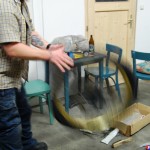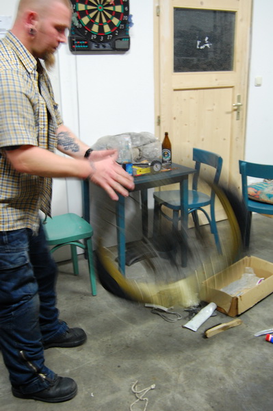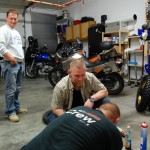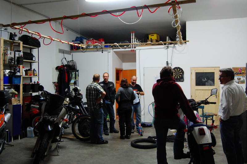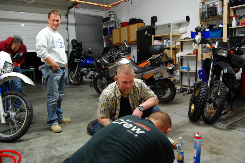 naja eigentlich wollten wir nur zum Marokkovideo ((vom AT Stammtisch)) Schauen in die Werkstatt und um bei der KLE die Verkleidung wieder anzubauen und mit heim zu nehmen. Wie es aber so oft ((eigentlich wirklich haeufig)) findet sich erst etwas zum interessiert Kucken, in dem Fall ein Satz Heidenau K60, ((hmm, ich glaub statt TKC80 versuche ich den nach dem Tourance EXP)) der auf 2 gueldene Affentwinfelgen sollte und dann zum Anfassen ((der genannte K60)). Denn der froehliche Monteur sah nicht so ganz souveraen aus, nahm freudig diverse gutgemeinte Ratschlaege an ((einfetten schadet nie, Felgenschoner sind nicht giftig, da musst Du schon mit Kraft ran..)) und weil man ja immer freundlich und hilfsbereit ist, packt man dann doch mit an. Also Hinterreifen zuerst ((weil man da deutlich laenger dran haengt)) und danach in weniger als 15 Minuten ((wie lange man hinten gezerrt hat, trau ich mich gar nicht sagen)) den Vorderreifen gewechselt. Tja, wieder eine gute Tat und der Reifenbesitzer schwoert es auch in Zukunft lieber beim Reifendienst zu machen -„Aber gut zu wissen, dass es machbar ist .. so fuer die Reise“- Das Video habe ich zwar fast gaenzlich verpasst, die paar Minuten die ich sah waren aber sehr schoen ((wobei mich aktuell die Wueste eher noch nicht reizt)).