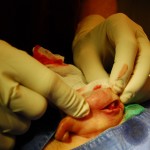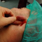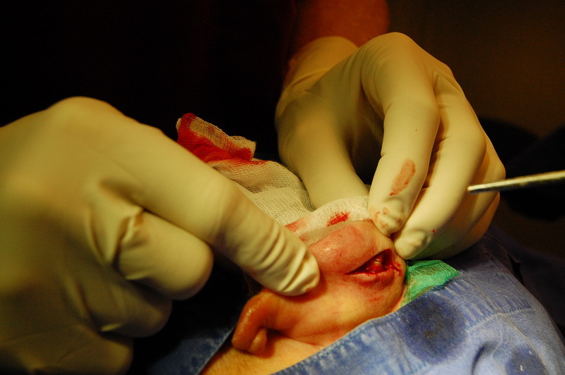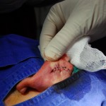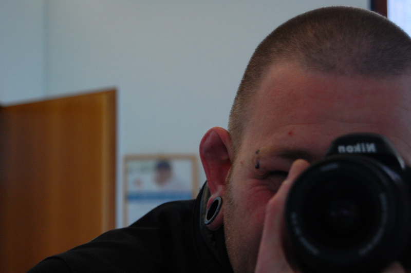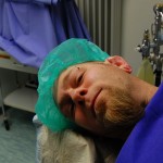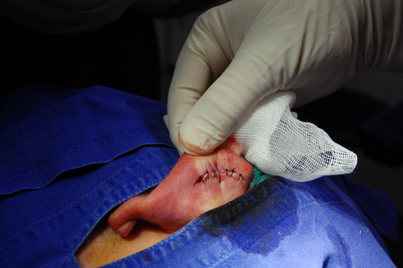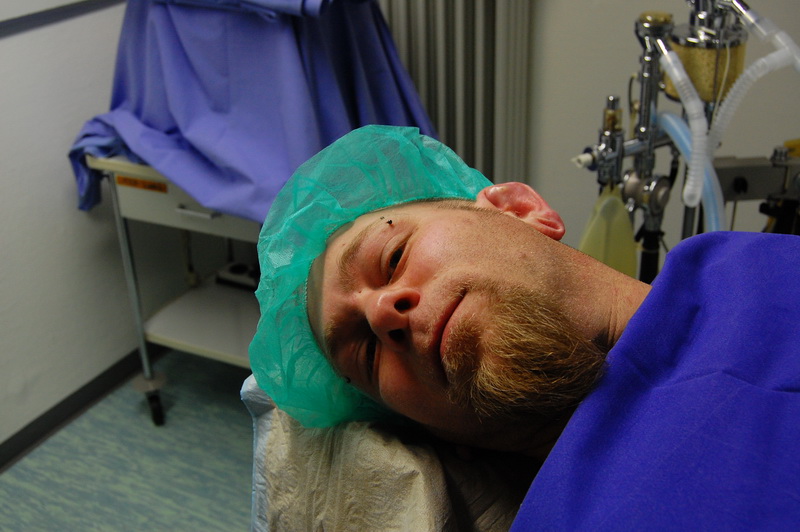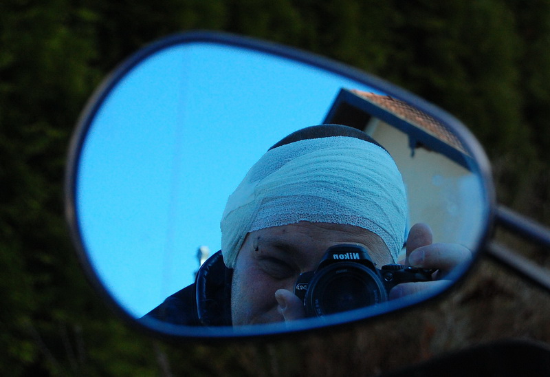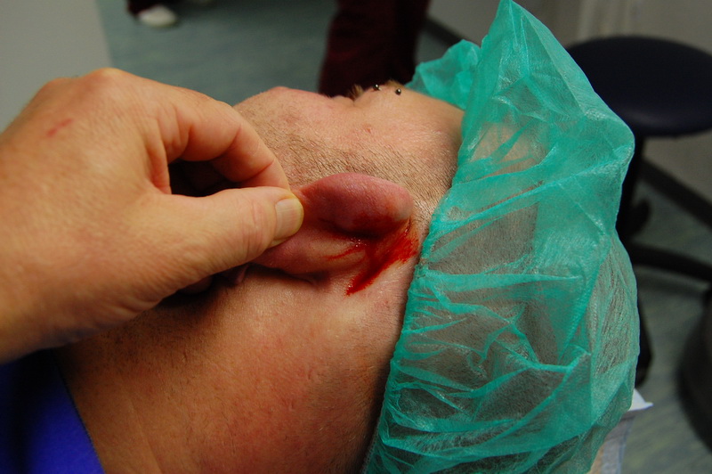 wie man unschwer erkennen kann, ist mein Ohr ((welches zwar gross aber intakt war)) ein klein wenig aus der Form geraten. Normalerweise bekommt man so einen Loeffel ((im Volksmund Blumenkohlohr)) von Schlaegen oder wenn man die Ohrmuschel ((respektive den Knorpel darin)) bricht oder sonst wie verletzt. Nun ringe ((Ringerohr)) ich nicht und boxen ((Boxerohr)) ist auch nicht mein Zeitvertreib. Bleibt als weitere ((und logische)) Moeglichkeit ein Helm. Eventuell einfach zu unsanft den Helm aufgesetzt oder laengere Zeit mit umgeklapptem Ohr gefahren. Merkt man manchmal erst nach ein paar Minuten, weil es am Anfang nicht schmerzt. Jedenfalls wuchs mein Ohr immer weiter an, mehrmaliges Punktieren ((Kliniject Venenverweilkanuelen habe ich reichlich)) und ablaufen lassen der klaren Fluessigkeit ((Lymphe)) brachte nur kurzweilige Besserung, so dass ich beim HNO Arzt mit inkludierter Chirurgie vorstellig wurde. Nachdem ich mehrfach ablaufen liess und es sich immer ueber Nacht wieder fuellte, beschloss man dem ein Ende zu setzen, indem man den Herd und die schadhafte Stelle einfach entfernt. Tja, so wurde mir heute morgen der Lauschlappen geoeffnet, fleissig geschnitten und genaeht und nun sehe ich aus wie .. naja, wie ich eben mit Verband aussehe. Freundlicherweise hat man abwechselnd bei der OP assistiert und Photos gemacht. Herzlichen Dank dafuer. Ich komme mit dem Turban Wickel um den Kopf sogar in den Crosshelm. Sonst haette ich ja heimlaufen muessen.