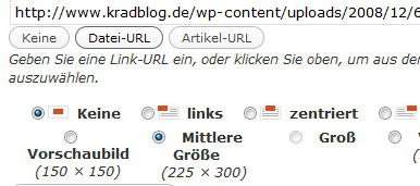Manchmal kann es so einfach sein, man muss nur genau hinsehen und schon faellt es einem wie Schuppen aus den Haaren. Nach dem Update von WP 2.5.* und 2.6.* auf 2.7 springt das froehliche Lightbox2 bei neuen Artikeln nicht mehr an, keines der Bilder wird in dem schoenen dunklen Kasten dargestellt, nur die alten (pre 2.7) gehen. Ulkig eigentlich. Viertelstunde im Source des Artikels vergleichen haette ich mir echt schenken koennen, es ist nur eine Kleinigkeit, naemlich genau das „da kann ich ja gar nichts mehr anklicken“. Seit WP 2.7 ist schlicht ein einziges Mal, beim ersten Bild, welches man hochlaedt, der Button „Datei-URL“ zu druecken und schwupps kapiert Lightbox2 (und Shutter reloaded uebrigens auch), dass er aktiv werden soll. Diese Einstellung, wie auch die Groesse des Vorschaubildes merkt sich WP 2.7 auch, so dass ab dem naechsten Upload alles wieder so ist, wie gewohnt.