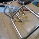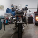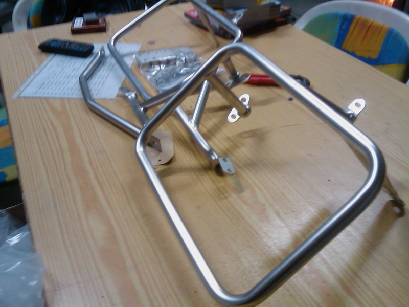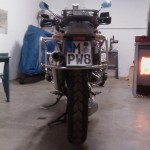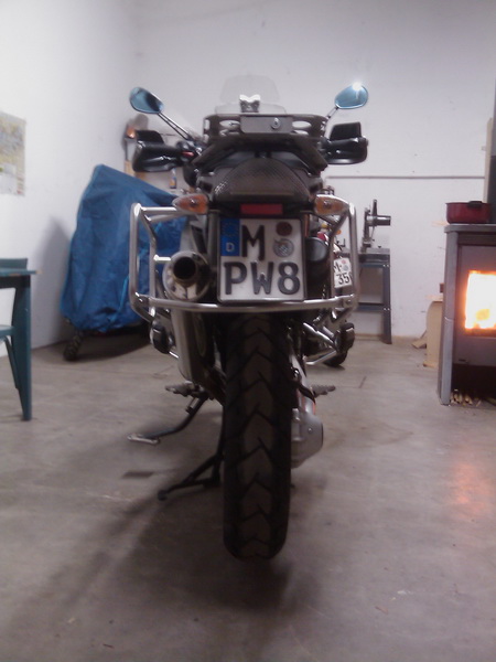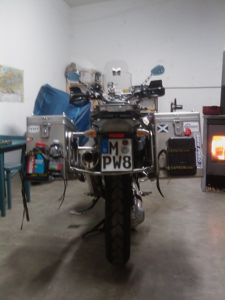 Touratech hat die magischen Finger an meine angegammelten Koffertraeger gelegt, ein paar ziemlich kuriose Beschwoerungsformeln in den Bart gemurmelt, einen kleinen Lederbeutel mit Knochen ueber einer roten Samtdecke ausgeleert und zum Abschluss aus meinem Kaffeesatz gelesen. So jedenfalls wurde mir erlaeutert, sei der Umstand zu erklaeren, warum mein silbern beschichteter Koffertraeger, den ich reklamierte, nun in poliertem Edelstahl erstrahlt. Jedenfalls hat sich die Zeit des Wartens gelohnt ((ich habe bei der Abgabe nur verlauten lassen, im Maerz wolle ich ihn wieder haben)) und nun ist er auch wieder montiert. Der Anblick des monstroesen Kofferhecks ist immer wieder ein kleiner Schock. Die Karre ist damit satt 99,5 cm breit. Sieht aber aus wie 1.50 m.