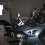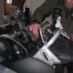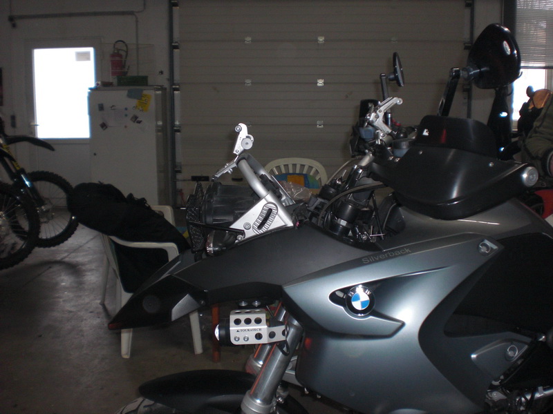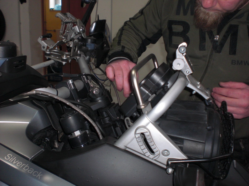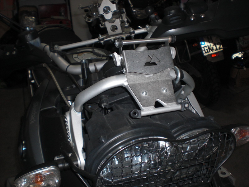 Nun ab in die Werkstatt und den alten Navihalter demontiert und alles vorbereitet fuer den neuen Halter, der ueber die Instrumente kommen soll ((der zumo ist so flach, an der Lenkermittelstrebe sehe ich mit Tankrucksack nichts)).