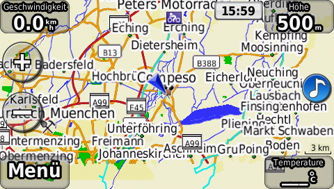 Jedoch kein Licht ohne Schatten, so hat die aktuelle Betaversion der Firmware natuerlich auch noch kleine Bugs. Prompter Absturz folgt, wenn man einen Track von etwa 150 km Laenge hat und dessen Hoehenprofil ansehen will. Plopp, Navi aus. Reproduzierbar. Oder aus dem Hauptmenue heraus eine Route oder Trackback aufrufen, man landet in der klassischen Darstellung des Routingbildschirmes. Menue -> Karte und man hat wieder die gewuenschte Darstellung ((in meinem Fall die „more View“)). Aber das sind Kleinigkeiten denen in der Betaphase keine grosse Bedeutung beigemessen werden sollte.