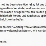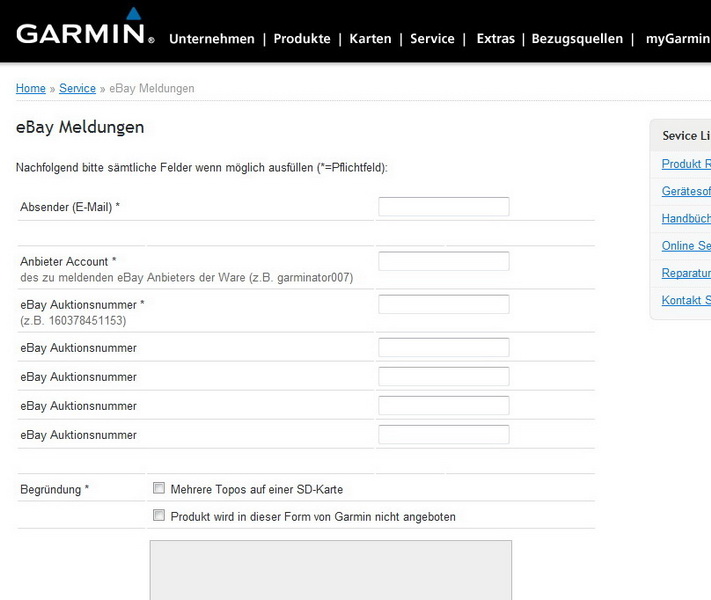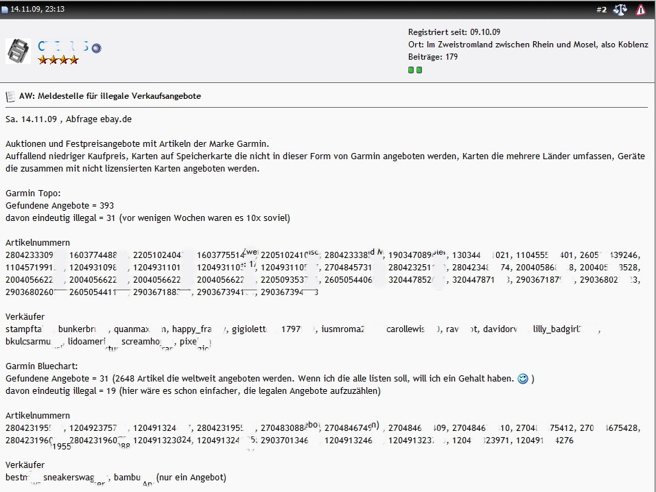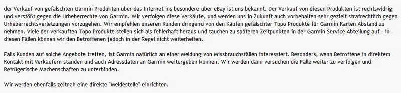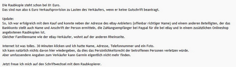 ist und bleibt, der Denunziant. Vielleicht sollte sich der ein oder andere dieses Zitat von Hoffmann von Fallersleben ((ja, der Verfasser des Liedes der Deutschen, auch bekannt als Nationalhymne)) ein klein wenig zu Herzen nehmen. Der Reihe nach. Im Garmin Supportforum wird nicht nur dazu aufgefordert ebay Verkaeufer namentlich bei Garmin zu nennen, sondern auch „verdaechtige Auktionen“ zu melden. Am besten mit Namen und Anschrift des Verkaeufers, der Artikelnummer der Auktion(en). Das schlimme an der Aktion, die User ((jedenfalls eine Handvoll)) jubeln und feiern die Moeglichkeit fuer Garmin die Drecksarbeit machen zu duerfen waehrend die Moderationsriege so Zeug erzaehlt wie „wir werden strafrechtlich verfolgen“. Da dreht sich einem doch der Magen um, „strafrechtlich verfolgen“. Fuer was halten sich die Mitarbeiter von Garmin Deutschland? Ermittler, Strafverfolger, Richter und Henker in Personalunion? Unabhaengig von der Tatsache, das „niemand den verfassungsrechtlichen Anspruch auf Strafverfolgung Anderer hat“ ((BVerfGE 51, 176, 187)), ist diese Aktion und die oeffentliche Nennung von ebay Verkaeufernamen doch reichlich bedenklich. Die Artikelnummern und Verkaeufernamen sind im Original nicht unkenntlich gemacht. Erschreckend wie sich manche Menschen vor den Karren spannen lassen. Einige gehen soweit, die „verdaechtigen“ Artikel zu kaufen, nur um dann bei Garmin Namen, Anschrift, Bankverbindung und sofern ueber das Internet ermittelbar, weitere persoenliche Daten des Verkaeufers angeben zu koennen. Meine Herren, ich bin sprachlos aber nicht sprachlos genug um nicht hier meinen Senf abgeben zu koennen.