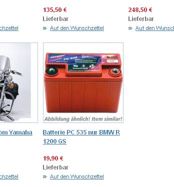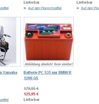 ein grosses Hallooooo ging durch die Reihen der Foren, in denen sich GS Fahrer vorwiegend tummeln. Der Polo Onlineshop verkaufe die Hawker Gelbatterie PC535 fuer 19.90 EUR ((in Worten neunzehneuroneunzig)), verkuendete man dort. Dass es sich hierbei um einen schlichten Eingabefehler handeln muss, sollte zwar selbst fuer einen Laien sofort ersichtlich sein ((kostet die Batterie in der UVP das zehnfache)) aber wenn man den Schreibern glauben schenkt, so wurde gleich mal bestellt bis der Arzt kommt. Einige wollten 2 oder 3 bestellen ((fuer ebay oder schlechte Zeiten)) und es entspann sich ein Diskussion, wie man denn nun seine Ware einklagen koennte. „Am besten per Vorkasse zahlen, dann kommen sie nicht raus“ oder „dumm stellen und mit Anwalt drohen“ sind die ersten Ideen. Da grewselt ((doch doch, das Wort soll so)) es einen schon ein bisschen. Wenn im Supermarkt der Schnaps falsch ausgezeichnet ist, droht doch auch keiner der Kassenkraft Pruegel an ((oder alternativ mit dem Anwalt)) bis sie die Pulle zum Sonderpreis rausrueckt. Der Preis entscheidet sich eben an der Kasse oder mit der Auftragsbestaetigung vom Onlineversender. Da muss man nicht hellsehen koennen, um sich auszumalen, wie viele nun an ihre Hawker Akkus kommen. Aktuell kostet die PC535 bei Polo statt 179.95 EUR „nur“ 125.95 EUR und ist damit schon ein gutes Angebot aber fuer 19.90 EUR, da dreht man gerne mal hohl. Viel Erfolg oder besser AGB lesen und damit leben, dass andere eben auch mal Fehler machen.