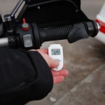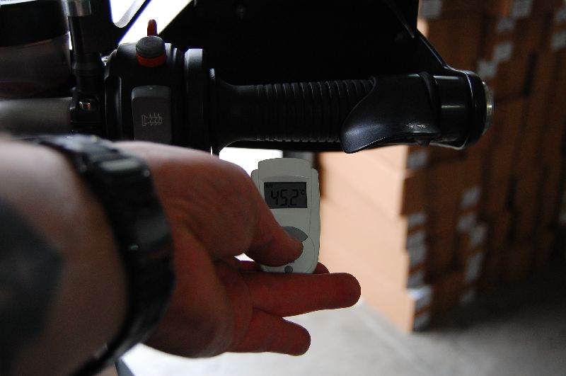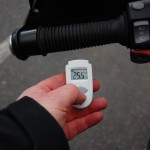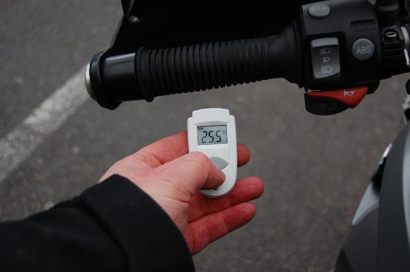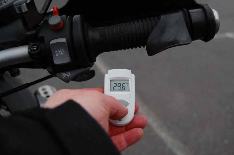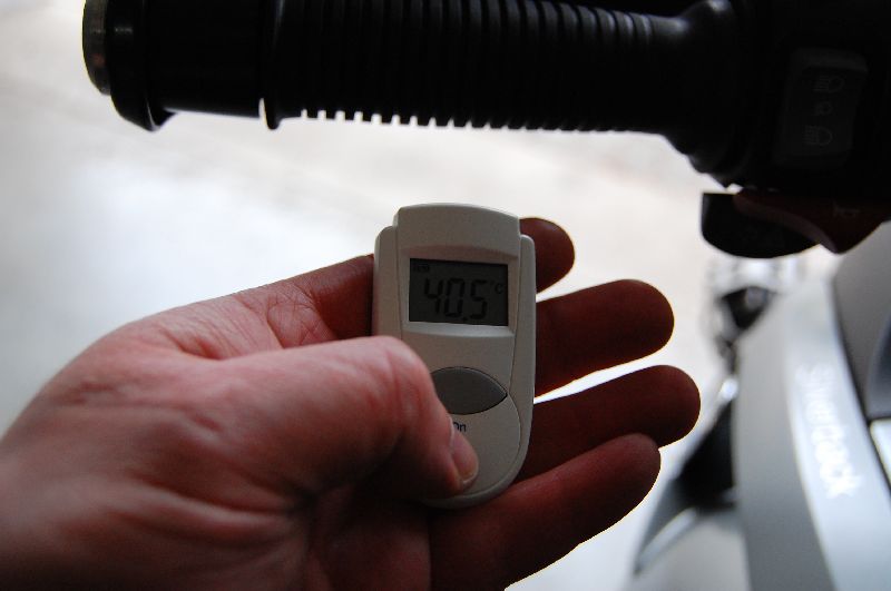 sprach ich zu meinen Heizgriffen. Ok, urspruenglich wollte ich den Beitrag „Die Krad-Knaus-Ogino-Messmethode“ nennen aber das war ja fast noch bloeder. Die neuerliche Inspektion der Heizgriffe brachte wieder reges Heizen in den linken Griff und da $Kollege einen Thermometerfetisch hat ((sowas gibts, ehrlich)), konnte ich kurzfristig ein fuer diese Zwecke brauchbares Temperaturmessgeraet ergattern. Eingangs sehen wir die aktuelle ((heute Nachmittag um kurz nach 15:00h)) Aussentemperatur, 10°C. Der linke Griff hat 14.9°C und der rechte 12.9°C. Heizgriffe stehen kurz darauf auf Stufe I und ich fahre zur 20 km entfernten OMV Tankstelle. Nun zeigt der Linke 25.5°C und der rechte 29.6°C. Im Anschluss geht es mit den Heizelementen auf Stufe II zur Werkstatt ((Spezi trinken, rumlabern, in den Ofen schauen)). Bei Ankunft in der Werkstatt zeigt das Thermometer links 40.5°C und rechts 45.2°C an. Dass die linke Seite ein klein wenig kaelter bleibt, bestaetigt sich in der Messung und ich nehme zur Kenntnis, dass auch ein kleines bisschen Isolierband ((traditionelles oder auch selbstverschweissendes)) durchaus in der Lage ist, die Temperatur zu mindern. Da rechts der Griff selber ja bewegt wird ((Lautstaerkeregler fuer den Endtopf)), musste kein Band verwendet werden. Gut, der Unterschied ist nun nicht weltbewegend aber ich wollte es eben wissen. Nun weiss ich es. Fein.