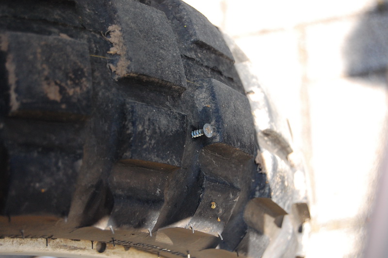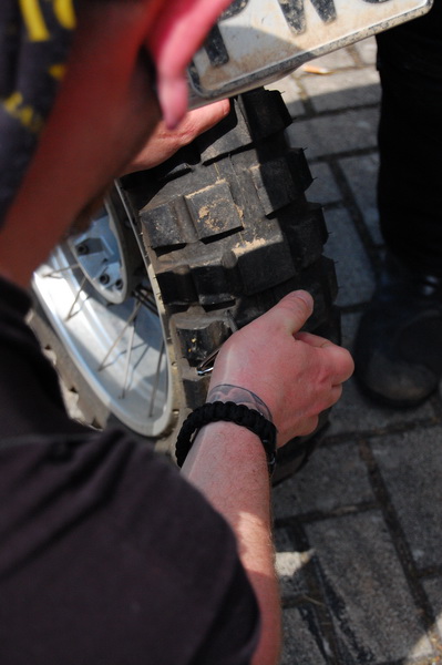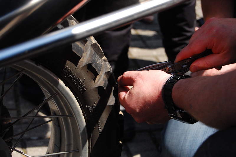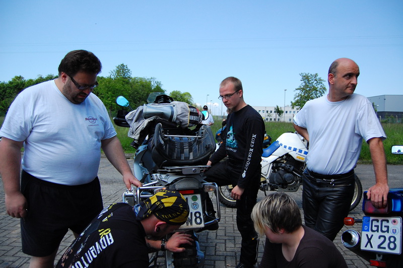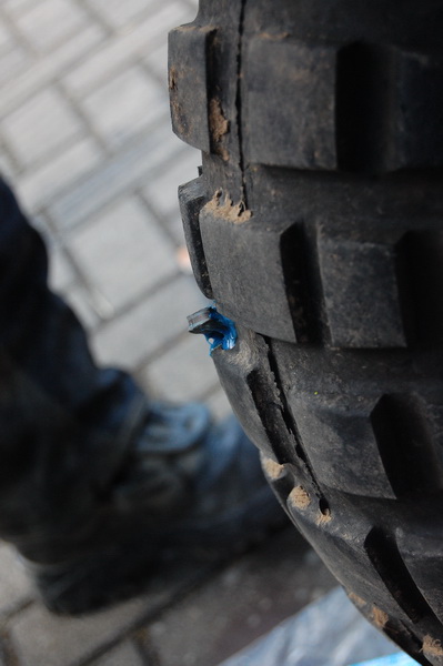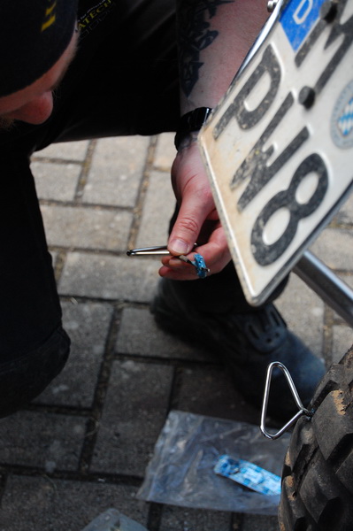 am zweiten Morgen ((eigentlich war es schon mitten am Tag)) der Megafete 2010, stand eine kleine Ausfahrt in den Schwarzwald an. Ein paar Frischlinge im Schlepptau wurde X-treme Rumschwuchteling geplant. Ich habe also die GS vom ihrem Standplatz neben dem Zelt ((weil ich Strom im Zelt ueber die GS beziehe)) auf den Burnoutplatz gefahren und will aufroedeln, als ich eine Schraube in meinem hinteren Pneu entdecke. Prima, fast neuer (TM) Reifen ((keine 2000 km Offroad)) und dann ein Loch. Die Schraube wurde entfernt ((Leatherman regelt)) und schlagartig verliert der Reifen Luft ((achwas?)). BMW Pannenset ((Anno 2004, als es das noch dazu gab und nicht nur ne Servicecard)) auf dem Bordwerkzeug gezogen und geflickt. Hielt die Schwarzwaldtour ((140 km)), die Heimfahrt ((450 km)) und wird wohl bis zum natuerlichen Ende des Reifens auch halten.