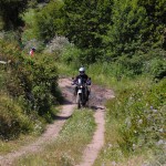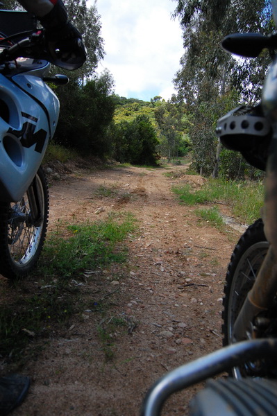 Vor allem Matsch und Sand. Der Matsch ist ja ganz geil, mit genug Schwung und wasserdichten Stiefeln kein Problem, beim Sand dagegen habe ich mich beinahe gemault. Das Vorderrad wandert der Spur ((oder was eine sein koennte)) nach, knickt leicht ein, die Fuhre schiebt mit dem Rad eine kleine Duene auf und dann .. ja dann heisst es ran ans Gas, sonst liegt man eben. Zwar weich aber man liegt. In meinem Fall aber zum Glueck nicht. Fein. Ganz fein schlug sich auch die Maschinenbaeuerin, bei Matsch ((knapp bis zur Vorderradachse)) voll durch ohne schlingern, keine Probleme im Sand ((Gas und durch als waere da Aphalt)) und Kies als fuehre sie nichts anderes im Urlaub ((erste Driftuebungen)).