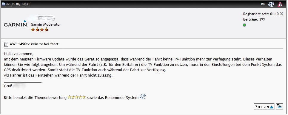 Aber das geilste ist eigentlich die neue Firmware fuer den Garmin nüvi 1490TV. Das Geraet hat einen ((wie der Name schon nahelegt)) einen TV Tuner und erlaubt ((bis FW 4.10)) das Fernsehen am Geraet, wenn man moechte. Nun kam die FW 4.10 fuer das Geraet und die TV Funktion ist nur noch gegeben, wenn man im GPS Simulationsmodus ((aka GPS Empfang AUS)) ist. Schliesslich duerfe man waehrend der Fahrt nicht fernsehen ((sagt allen Ernstes ein Garmin Mitarbeiter)). Was ich darf und mache und lasse, geht einen Garmin Mitarbeiter mal gepflegt einen Scheiss and und wenn eine Funktion, wie TV waehrend der Fahrt meine Mitfahrer unterhaelt, dann hat man nicht ungefragt diese Funktion zu entfernen. Gut, ich habe kein 1490TV und vermutlich kaufe ich auch nie eines aber die Deaktivierung einer Funktion, die moeglicherweise Kaufkriterium war, voellig indiskutabel. Letzte Hoffnung waere, dass diese Aussage einfach nur ein Irrtum ((das neue Bullshit)) war, weil man in der 4.10 einfach wieder mal Mist gebaut hat. Gamin erzaehlt ja auch, es seien nur SDHC Karten bis maximal 4 GB freigegeben, die Garmin Doku selber geht hier bis 8 GB SDHC ((und bei manchen Modellen bis 16 GB)).