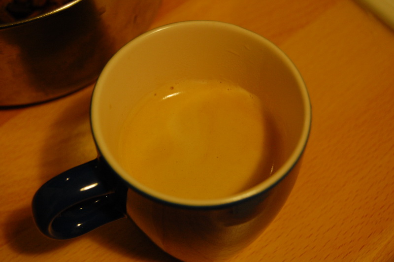 nach knapp 20 Minuten, einem verbrannten Finger, einer nassen Hose ((wollte die Bohnen auf dem Balkon schaelen)) und einem Fehlversuch ((220°C sind zuviel fuer die Bohnen, bisschen verbrannt)) kann ich meine eigene Roestung in den Vollautomaten geben und schon habe ich einen frisch geroesteten, gemahlenen, gebruehten Kaffee. Lecker. Nur am Mahlgrad muss ich noch feilen. Nichts fuer jeden Tag aber so ab und an….