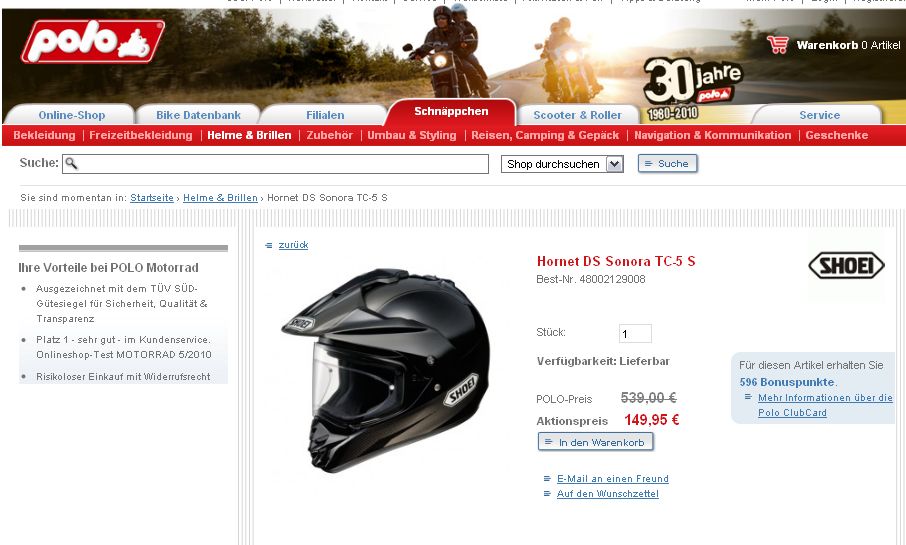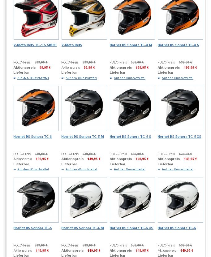 ueber die Hintergruende kann man spekulieren, eine exzessive Lagerraeumung, Notverkaeufe aus Gruenden der schnellen Geldbeschaffung oder ein amoklaufender Onlineshop. Jedenfalls bietet man aktuell die Creme de la Creme der Offroadhelme, sprich Shoei Hornet DS, Shoei X-Moto und Shoei VFX-W zu Preisen an, die unverschaemt guenstig sind. Gegen einen Fehler, wie bei der Sache mit der Hawker PC535, spricht die Tatsache, dass es schon seit Tagen so guenstig ist und auch die Filialen ((angeblich)) zu diesem Preis verkaufen. Unglaubliche 149.- EYPO fuer einen Hornet DS Sonora TC-6 in weiss-schwarzem Design und dann noch die 30% Sonderrabatt auf reduzierte Artikel? Unfassbar. Mal sehen ob und wo da ein Haken ist.