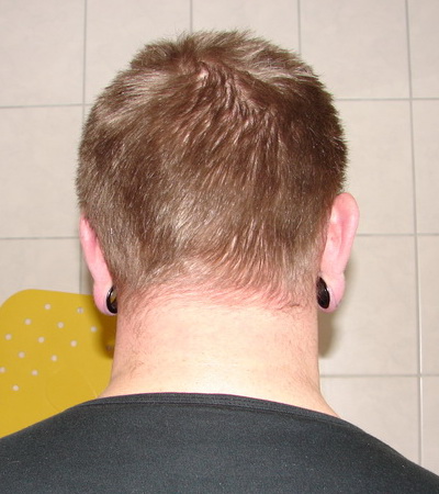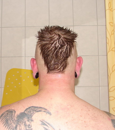 bevor ich mich in der Maehne endgueltig verheddere, war es an der Zeit den alten Zopf mal zu entfernen. Eine Wohltat ohne die Wolle und ich passe auch wieder in meinen Helm. 😉 Aber mal im Ernst, wenn man ausser Wirbeln nur noch Wirbel auf dem Kopf ((das war schon anno 1973 beim Friseur echt schlimm)) hat und die bloeden Haare immer im 90° Winkel vom Kopf abstehen ((ausser mit Muetze, da stehen sie dann kreuz und quer aber nicht brauchbarer)), kann man sich eine Langhaarfrisur ((alles ueber 10 mm)) echt stecken. Nun, das letzte Photo zeigt den Status Quo ((naja, jetzt trag ich ein T-Shirt)) und ich bin am zweifeln ob ich dieses neumodische Dingens am Hinterhaupt nicht wieder entfernen soll, ich bin ja keine 20 mehr .. oder 30 .. meine Herren, ich bin alt!