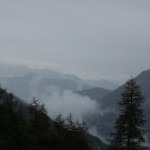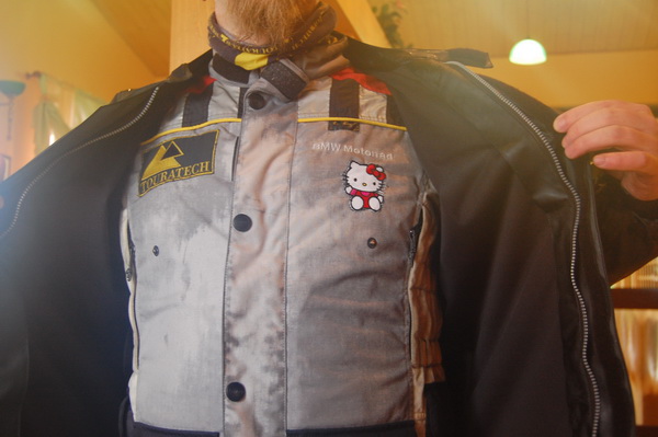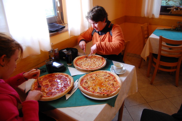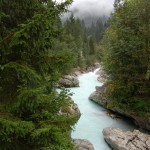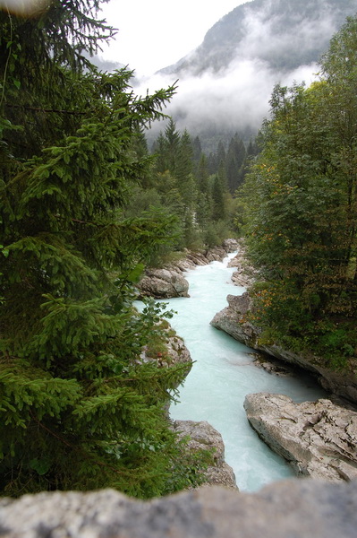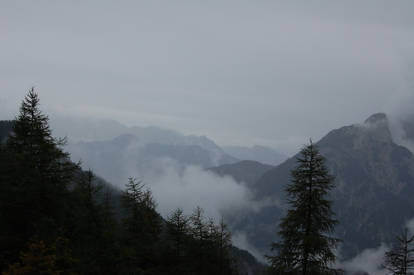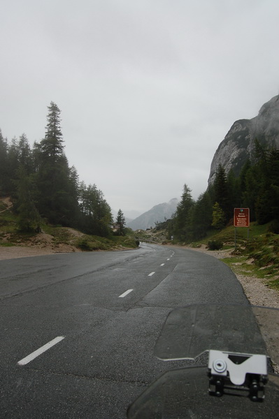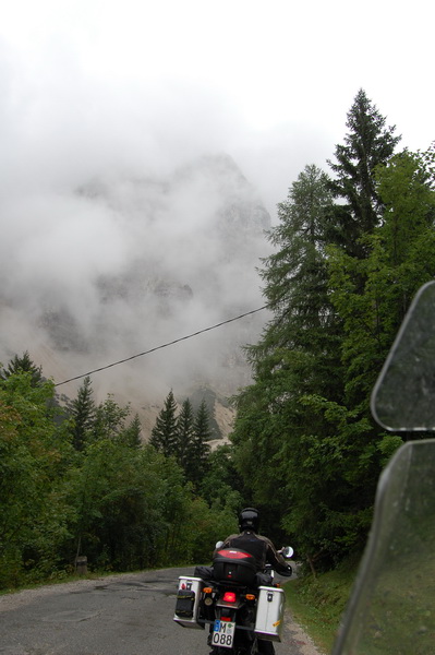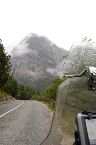 aufgestanden um 08:30h, also vor dem erwarteten Zeitpunkt, denn im Urlaub tendiert man ((also primaer ich)) dazu, andauernd zu spaet aufzustehen und den Zeitplan nicht einzuhalten. Bei fiesem Nieselregen ueber den Vrsicpass und dann weiter ins Socatal bei stroemendem Regen. Die Fahrt ging kreuz und quer durch Slowenien und nach 3 Stunden waren wir vollkommen durchnaesst. Naja, nicht alle. $Kind_2 hatte ueber den Moppedklamotten eine Regenpelle ((2-Teiler)) von Louise und die ist dicht. Dafuer schiffte es permanent in den offenen Crosshelm. Ich hatte eine Vollgummijacke von Prolo an, die nach 2,5 h aufgab und mich bis auf die Haut durchweichen liess. Nur die Reuschhose und die Haix Stiefel, die waren dicht. Richtig erwischt hatte es die Maschinenbaeuerin, Mohawkjacke nicht ganz dicht und Mohawkhose vollkommen durch, der Regen lief bis in die ((dichten)) Daytonastiefel.