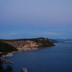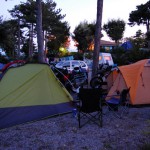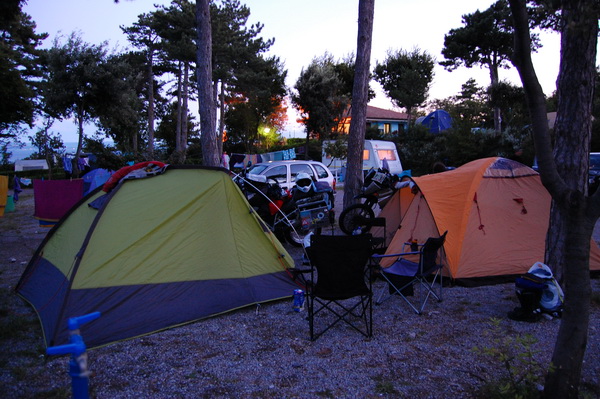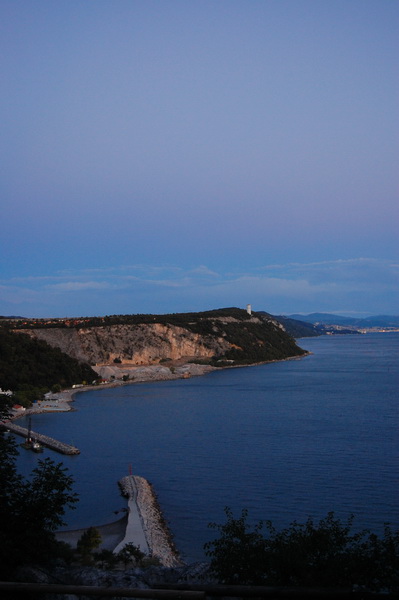 Wie dem auch sei, in Nova Gorica wurden dann kurzerhand fuer die Durchweichte eine XL ((gab keine andere)) Regenkombi ((auch 2-Teiler)) in freundlichem Schwarz gekauft. In Dutovlje wollten wir uns nur kurz unterstellen, als am Horizont ein strahlender blauer Himmel zum Vorschein kam. Also noch Pizza gegessen und gewartet, bis das gute Wetter bei uns angekommen ist. Der Sonne folgend, Hauptsache weg vom Unwetter, kamen wir in Triest raus. Einen x-beliebigen Campingplatz angesteuert, 32.10 EUR bezahlt und fein geschlafen, mit Blick aufs Meer und den Hafen.