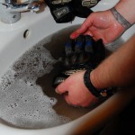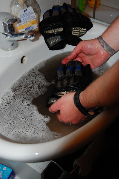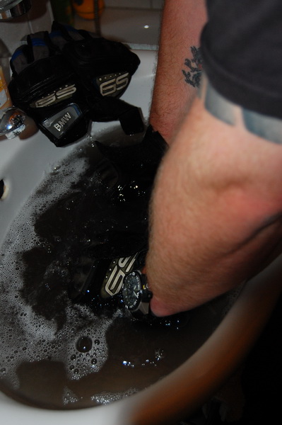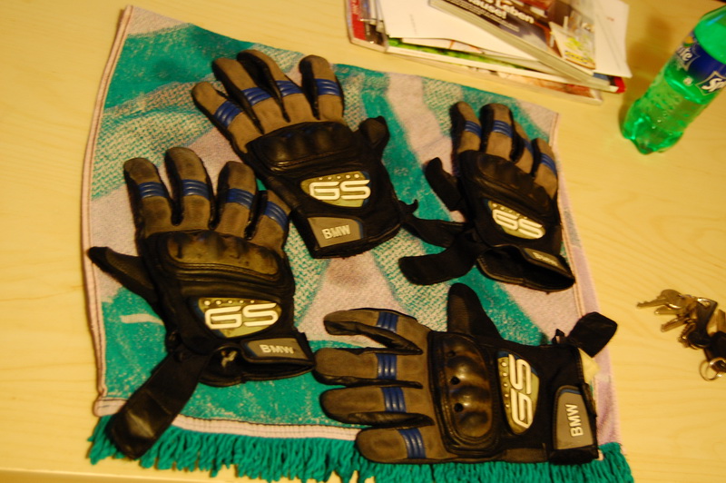 seit mittlerweile 5 Jahren ((oder doch schon 6?)) fahre ich bei Wind und Wetter mit meinen Lieblingshandschuhen, den guten alten BMW Rallye GS in Blau, Gr. 10 1/2 spazieren. Regen, Schnee, Kaelte, Hitze, Sonne, Hagel … wenn es nicht wirklich unabdingbar ((Erfrierungen will ich mir ja nun nicht holen)) ist wasser- und winddichte, gefuetterte Handschuhe ((sprich: warme, muckelige, teure)) zu nutzen, trage ich diese Handschuhe. Vor ein paar Monaten ((ich sehe gerade, es ist 1.5 JAHRE her)) liefen mir die Held Speedfour ueber den Weg, auch sehr angenehm aber die BMW Handschuhe habe ich nie weggeworfen. Und weil ich der Heldenhandschuhe ein wenig ueberdruessig bin, wurde heute eine Grosswaesche meiner BMW Handschuhe getaetigt. Man will gar nicht wissen was sich ueber die Zeit fuer ein Dreck da ansammelt. Mehrfache Waschungen waren notwendig. Nun muss ich nur noch an einem Zeigefinger das Loch flicken, denn Handschuhe finden ist nicht ganz einfach.