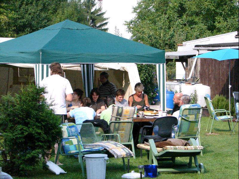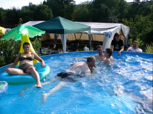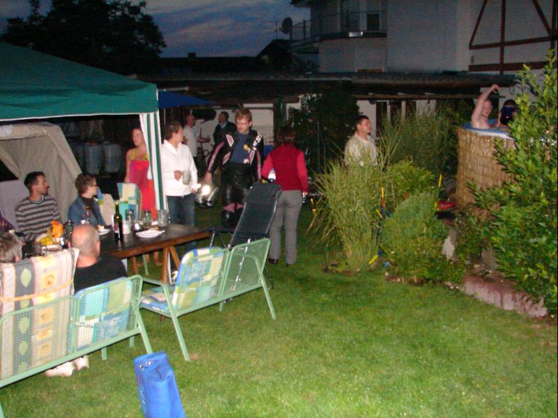 Nach dem errichten eines SG500 Mannschaftzeltes, aufstellen diverser Biertischgarnituren, herantragen von selbstkuehlenden Bierfaessern, Colakisten, tote Tiere (mariniert und in Darm), Gruenzeug (iss nicht Salat weil Du Tiere magst, iss ihn weil du Pflanzen hasst) konnte man sich dem Pool zu abkuehlen naehern und einfach zusehen wie die anderen Gaeste eintrudelten. Uns es wurden viele.