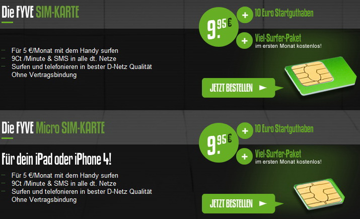 nach dem Reinfall mit Vodafone Irland sah ich im Farbfernsehgeraet eine Reklame fuer fyve. Fuer eine PrePaidkarte wirklich interessant und die Datenoptionen, die sich nicht automagisch verlaengern, waeren eigentlich ideal fuer mich ((vergesse ich doch hin und wieder Dinge zu kuendigen)). Nachdem ich wohl zu den ersten Bestellern gehoerte, verzoegerte sich prompt die Auslieferung aufgrund „enormer Nachfrage“. Tja, nach ein paar Tagen kam die Karte dann endlich an, funktioniert auch einwandfrei aber die versprochenen 10.- EUR Guthaben ((statt 1.- EYPO)) sind nicht drauf. Da dieses Startguthaben sehr wohl bei Anderen vorhanden ist, scheint es kein genereller Fehler zu sein. Vielleicht sollte ich einfach doch bei meiner inzwischen 10 Jahre alten T-Mobile Karte bleiben, dieses ewige Theater kann schon richtig auf den Sack gehen. Vodafonetochter hin oder her, eine Hotline mit 01805er Nummer und keine Antwort ((ausser automatisierten Eingangsbestaetigungen)) auf Mails, sind nicht gerade vertrauensfoerdernd. Tja. so habe ich eine fyve Karte mit 1.- EYPO Guthaben, einer „Vielsurferflat“ ((150 MB/Monat mit UMTS)). Wenn man wenigstens ((wenn man schon die 10.- Guthaben nicht rausrueckt)) das Flatrate-Paket aktiviert haette ((hier ist HSDPA moeglich)) … aber so bin schon ein wenig unangenehm ueberrascht.