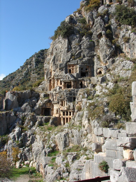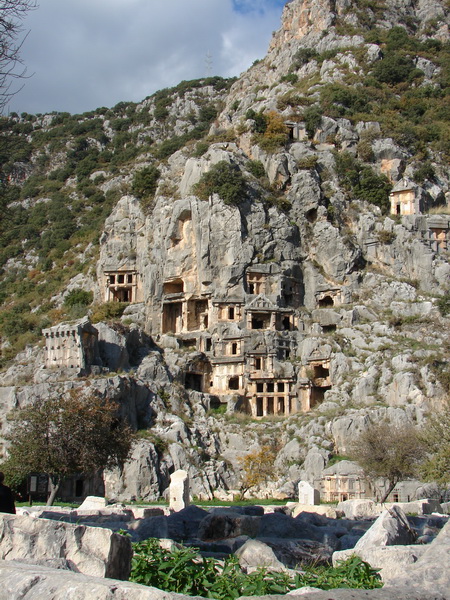 Myra, heute Demre, die Heimstatt vom Nikolaus. Zuerst zu den antiken Felsengraebern und dem Theater ein wahrlich kollosaler Anblick. Wieder frisch gepressten Orangensaft, fuer 2 tuerkische Lira und den Durst gestillt. Es hat laut Anzeigetafel an einer Apotheke 24°C. Nach der obligatorischen Besichtigung der Bischof Nikolaus von Myra Kirche und weitschweifenden Erzaehlungen ueber ihn und sein wirken haben wir 45 min Freizeit. Doener essen und nicht allzu aufdringliche Budenbesitzer abwimmeln bringt uns puenktlich 5 min vor Abfahrt ((geplante Abfahrt))auf den Busparkplatz. Wieder ein Paar dass keinen Schimmer hat was 14:00h und Abfahrt heissen soll diesmal ist es Pueppi und ihr Angetrauter. Danach weiter, immer der Kueste entlang, der Plan in naher Zukunft hier Mopped zu fahren ist am reifen.