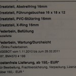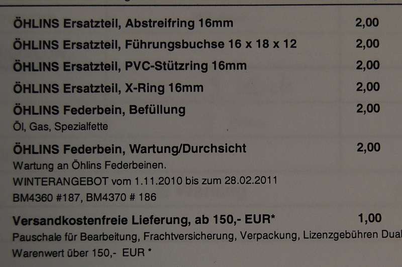 Die Wartung des Fahrwerks uebernahm diesmal die Firma Goede-Motorsport, welche in diversen Foren nicht gerade schlecht abgeschnitten hat, wenn es um zuverlaessige, gute und bezahlbare Servicearbeiten an Oehlinsfederbeinen geht. Mit Winterrabatt nur knapp ueber 220.- EYPO, dass ist im Vergleich zum Zupin mal eine Ansage, die sich gewaschen hat. Wie beim letzten Mal auch erhielt ich eine Tuete mit den ersetzten Kleinteilen ((Laufbuchsen, Dichtringe, etc..)) und einen Wartungszettel ((mit den Daten der Einstellungen, Klicks, Vorspannung, Druck)) um nach erfolglosen Versuchen wenigstens die Grundeinstellung wieder zu finden.