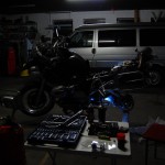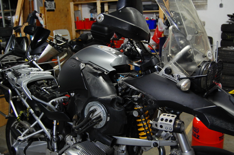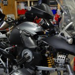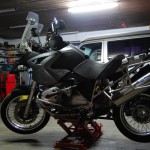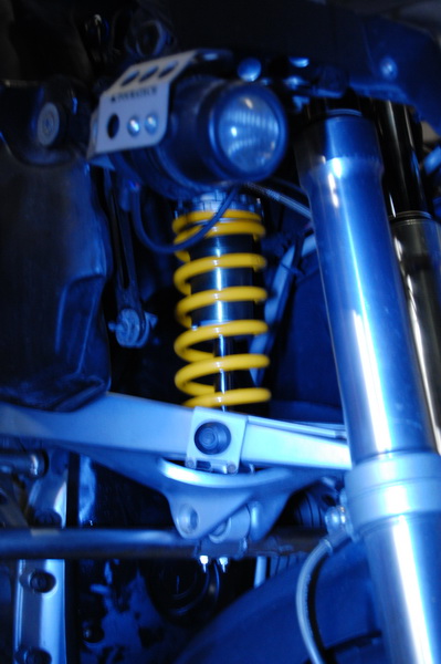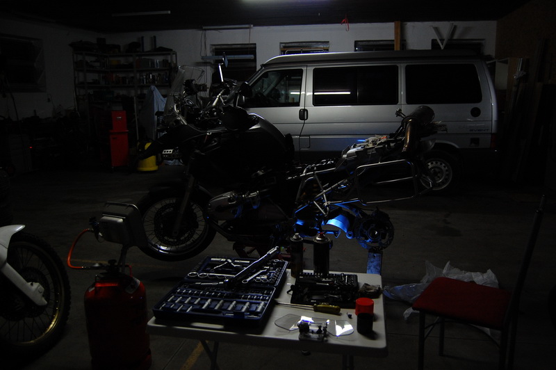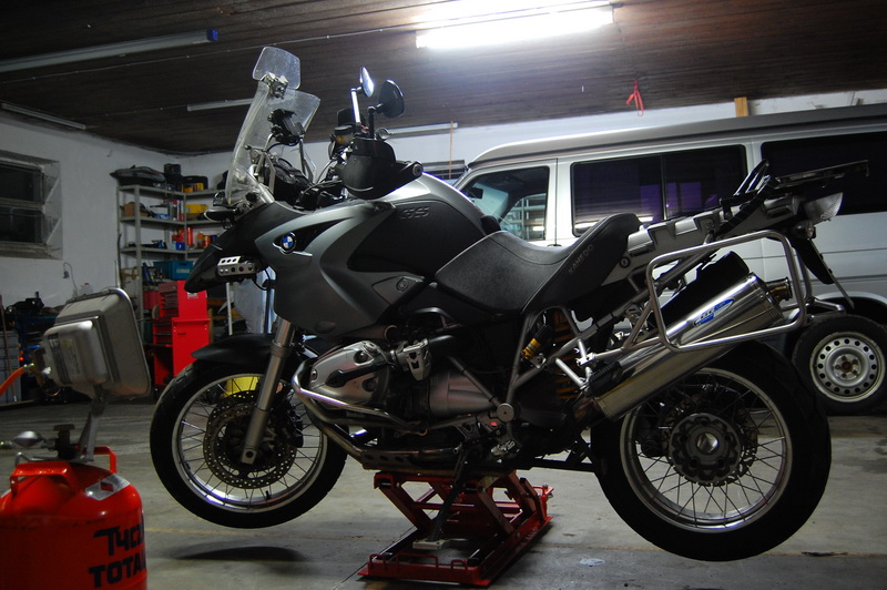 heute hielt ich nach knapp einer Woche ((seit dem Versand)) meine Oehlins Federbeine wieder in Haenden und ergriff die Gelegenheit, das Fahrwerk wieder einzubauen. Dank einer umfangreichen ((und vollstaendigen)) Liste der Anzugsdrehmente kam ich auch recht gut voran, der Einbau hinten war inkl. Endtopfreinigung in wenigen Minuten geschafft. Lediglich am vorderen Federbein war es eine muehselige Geschichte, da, wie schonmal beschrieben, die Oehlinsfeder dicker ist und man nur wenig Raum zum werken hat. Ein eingerastetes und eingeschlagenes ((wie auch sonst)) Vorderrad ist auch nicht so ganz hilfreich. Ja, ich hatte keinen Moppedschluessel dabei. -.- Interessant war auch die Tatsache, dass die Zylinderschuetzer ((BMW Kunststoffprotektoren fuer die Euter)) nicht in Verbindung mit dem Touratech Sturzbuegel passen, es ist ein knapper halber Zentimeter, der einem fehlt. Oder meine Sturzbuegel sind schon ein wenig deformiert, von dem ein oder anderen Plumps.