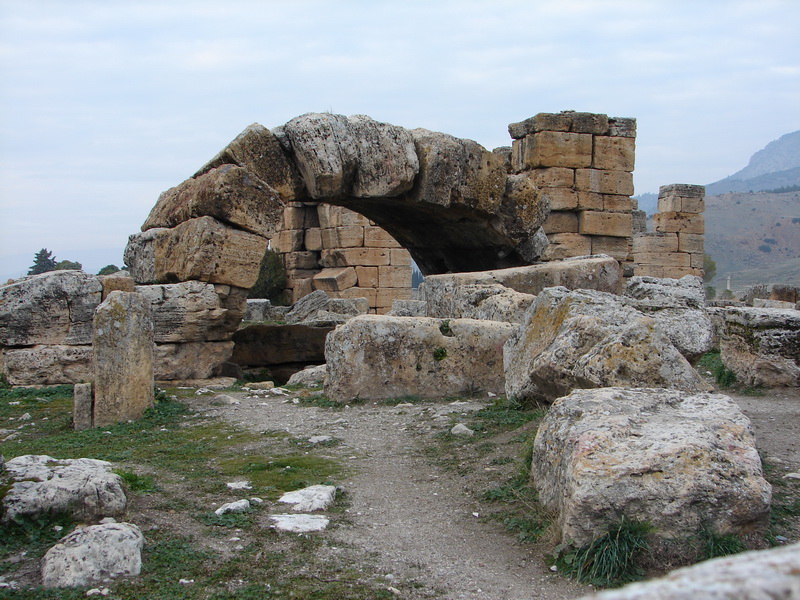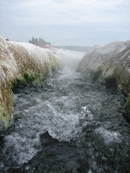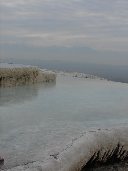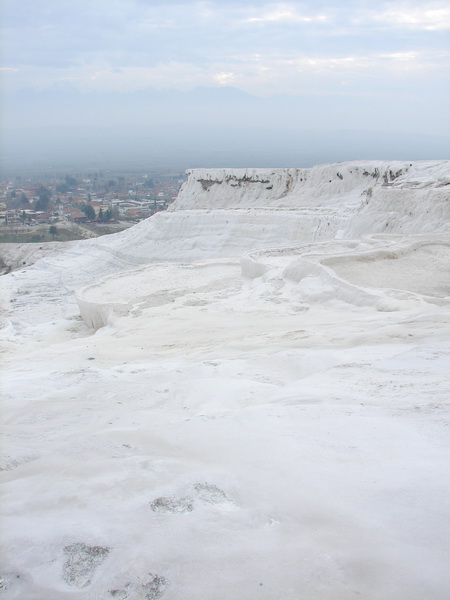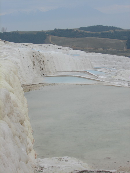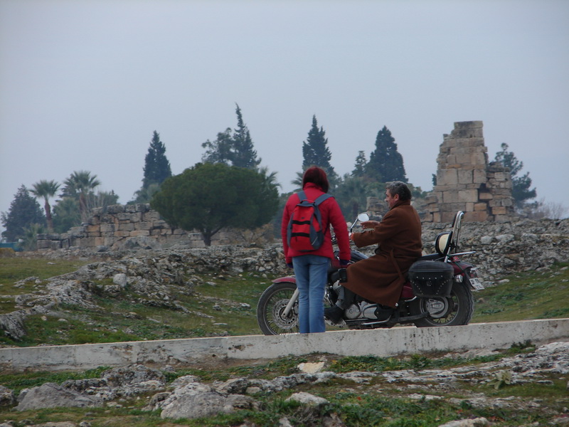 Die Terrassen von Pamukkale. Weiss. Man kommt um einen Gebirgszug herumgefahren, es geht ein wenig steiler als noch vor 5 min bergauf und auf einmal erscheinen weisse Felsen, einem Gletscher sehr aehnlich, der erstarrt am Hang festsitzt. Wir betreten wie immer durch kleine Drehkreuze unser Besichtigungsobjekt und gehen durch den Torbogen der Stadt Hierapolis, von der nur noch wenige Saeulen und Gebaeudeteile uebrig sind. Trozdem recht eindrucksvoll. An den Ruinen vorbei bewegen wir uns auf die beruehmten Terrassen von Pamukkale zu. Durch zahlreiche Hotels, welche an den Thermalquellen zapfen und ein natuerliches Versiegen der Quellen ist von den Prospektbildern der 80er Jahre nur noch ein trauriger Rest geblieben. Die Terassen sind bis auf wenige trocken und das schwefelhaltige Wasser hat die weissen Felsen in ein ungluecklich gewaehltes Gelb getaucht. Insgesamt trotzdem eine Augenweide, die Erzaehlungen unserer Reiseleitung ((die immer und zu allen was erzaehlen muss)) stimmen jedoch nachdenklich, denn es wird wohl in ein paar Jahren keine weissen Felsen mehr geben wie man sie aus dem Prospekt kennt. Barfuss darf man auf die Plateaus gehen und in dem schmalen Fluesschen, der seinen Weg durch den Stein gebahnt hat seine Beine und Fuesse waermen. Es ist seit dem Vormittag stark bewoelkt, eine Jacke sollte man anhaben, gefuehte 10°C etwa, merklich kuehler als an den Vortagen aber kein Vergeich zu Deutschland wie das abendliche TV Programm mitteilt. Was stark auffaellt, hier in den Bergen (paar Hundert Meter nur ueber NN) sieht man nur ganz wenige Palmen, dafuer Zypressen, Oliven, Kiefern. Und nur ganz wenige Katzen, lediglich in dem Bereich des Antique Pools, wo man auch Getraenke und Snacks kaufen kann sind ein paar. Draussen dafuer ueberall Hunde. Jede Groesse und jede Rasse ((vor allem der Mix daraus)) laeuft vor und hinter den Menschen her. Die Wachleute oder Aufseher der Anlage fahren auf 200ccm Crossern, vermutlich asiatischer Herkunft, durch die Gegend. Klar, klein, wendig, gelaendetauglich und es macht ihnen sichtlich Spass. Nur der Chef des Touristenbueros, der crosst nicht, der kam uns auf einer 1400 ccm Eierschaukel entgegen, WildStar oder NTSCHZ oder Shadowking oder keine Ahnung, so ein Dschobbrviech halt.