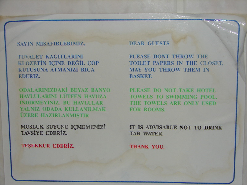 Nach 3 h Kalkstein fahren wir zum nur 10 min entfernten Hotel (Wellness, Spa, wasweissich) Laruj und erhalten ein Zimmer in App.-Siedlung 8. Wasser lauwarm, Klimaanlage heizt nicht wirklich gut und ist dafuer laut. Ok, dann eben Wellness. Denkste Puppe, der Thermalbereich (aussen) ist ueberfuellt, das Hallenbad dafuer kuehl, die Duschen klein und voll, die Umkleide quasi von 3 Bereichen einsehbar. Also kein Wellness heute. Das Buffett. Huhn, Fisch, eine Art Fleischpastete Nudeln, Reis, Pommes und wie immer die dutzenden verschiedener Vorspeisen des Landes. Highlight fand ich die junge Tuerkin, die auf dem Boden kniend Doezdemir ((sprich Doessdemoehr)) zubereitete, ein Teigfladen mit einer scharf gewuerzten Kaese- und Spinatfuellung. Dafuer habe ich die ewigen Suessspeisen ausgelassen. An das Sealight Hotel kommt das Laruj lange nicht ran. Im vorherigen Hotel war die Art der Praesentation, die Auswahl und die Organisation beim Essen absolut perfekt. In dieser Anlage steht man 10 min in einer Schlange, kurz vor einem verschwindet das letzte Huhn und die naechste Fuhre kommt in 5 min, man muss aber weiter ruecken und der Saal ist brechend voll. 10 Reisegruppen essen quasi gleichzeitig,man hat leicht zeitversetzt angefangen aber jede Gruppe ist nicht in 30, sondern wie wir in 60 min fertig mit dem essen, in unserem Falle eher laenger. Aber der Tag war sowieso anstrengend genug und soviel bin ich lange nicht gelaufen, also Katzenwaesche und ab ins Bett, vielleicht geht morgen frueh das warme Wasser vernuenftig. 07:00h ist die Nacht rum.