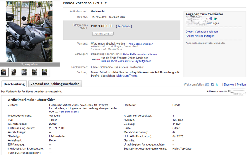 Eine Honda Varadero 125 in der Elektrobucht zu verkaufen ist nun erstmal nicht verwerflich. Was mich jedoch ziemlich aergert, ist die dummdreiste Art, seinen verunfallten Kahn zu verscherbeln. „..das einzig negative…Kratzer an Cockpitverkleidung und Hitzeschutz…“. Dann fabuliert man „…richtige Enduro sie ist unmöglich als 125 er zu erkennen und kann mit FS Kl. 3 gefahren werden.“ Hier hoert der Spass halt echt auf. Ohne den Zusatz „FS Klasse 3, ausgestellt/erworben vor dem 01.04.1980“ ist die Aussage schlicht gelogen und ich moechte das Gejammer hoeren wenn ein noch groesserer Depp das Ding kauft, faehrt, erwischt wird und wegen Fahren ohne Fahrerlaubnis am Sack aufgehaengt wird. Es gibt ja Kraftraeder, die man mit Klasse B ((und vormals Klasse 3)) fahren kann, wie diese schwulen MP3 LT ((Spurverbreiterung)) Dinger von Piaggio aber natuerlich nicht jegliches Kraftrad / 125er.