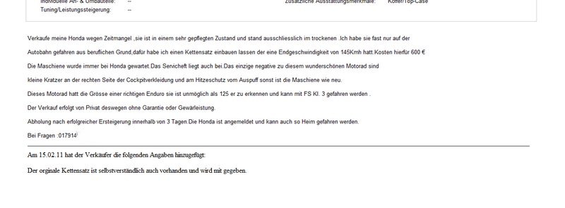 Dann hat der Verkaeufer einen „..Kettensatz einbauen lassen der eine Endgeschwindigkeit von 145 Kmh hatt. Kosten hierfür 600 €“ Alter .. wenn ich mal so einen Knallfrosch finde, dem ich einen Tunigkettensatz ((LOL)) fuer 600.- EYPO verkaufen kann, mach ich mich damit selbstaendig. Dass der Kaeufer dann direkt mit dem angemeldeten Krad heim fahren darf, legt zumindest die Vermutung nahe, dass der Kettensatz mit der Zauberuebersetzung nicht zum sofortigen erloeschen der BE gefuehrt hat … obwohl, ich will es gar nicht wissen.