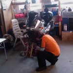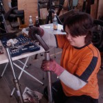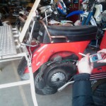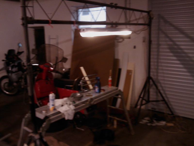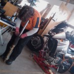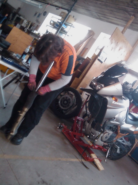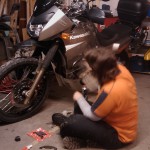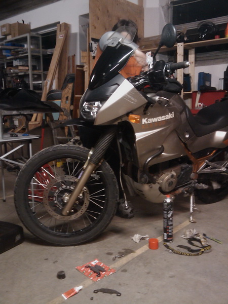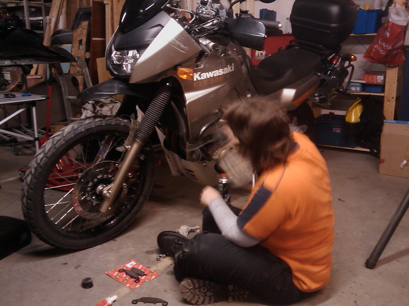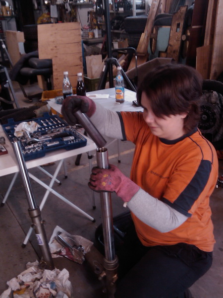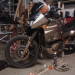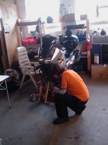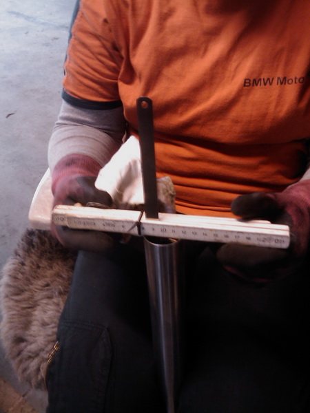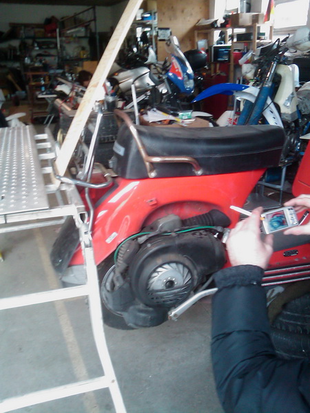 und das merkt man deutlich. Wenn man naemlich mit den neuen Wilbers Gabelfedern versucht den Kotfluegel auf den Reifen zu dotzen ((vorher ging das recht gut)), kommt man an seine Grenzen. Die progressiven Federn tun also wirklich ordentlich. Am heutigen verregneten Sonntag wurde in der Halle nebst einer Entkokung von Wolferls Wespe ((das rote Kleinod)) auch der Einbau der Geburtstagsfedern vorgenommen. Eigentlich recht schick so eine Lieferung von Wilbers. Progressive Federn ((enge Wicklung nach oben)), ABE, Anleitung, Aufkleber ((Werbung)), 1 l Gabeloel SAE 7.5 und ein T-Shirt ((Doppelte Werbung)). Vermittels hochprofessioneller Metalllineal an Zollstock geflanschter Messvorrichtung ((Bild 5)) zur Ermittlung der Luftkammer wurde also gebastelt und gebaut und zum Abschluss, waehrend die Vespa schon froehlich tuckerte ((gefuehlter Leerlauf 20 Umin)) noch die Bremsbelaege vorne erneuert. Alles in allem ein recht entspannter Tag und die KLE500 hat nun vorne wie hinten Wilbers verbaut. Der Wespe wurde bei der Gelegenheit der Schlauch des Ersatzreifens ((blank wie ein Babyarsch aber Hauptsache man hat einen unter der Backe)) am Heck verpasst. Das geht vollstaendig ohne Montageeisen, denn die „Felge“ ist zweiteilig. Ein paar Schrauben aufmachen, „plopp“ springen die beiden Haelften des Felgenringes ein Stueck auseinander. Nun Luft komplett ablassen, dann bekommt man den Schlauch einfach rausgezogen und den neuen hineingefummelt. Bisschen Luft .. bischen druecken .. bisschen schrauben, passt. War mir komplett neu, klappte aber gut .. irgendwie macht mich so eine Vespa fast schon an, ueberschaubare Technik, simple Funktionsweise… naja, mal sehen.