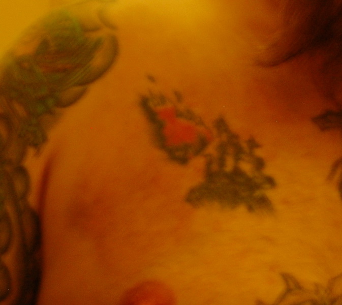 Die Brust siehtja echt übel aus. Solche merkwürdigen Flecken hab ich nach Prellungen noch nie gesehen. Ob das noch mal weg geht? Und was ist das für eine leichte Rötung dazwischen, partieller Sonnenbrand? SCNR