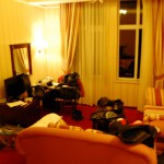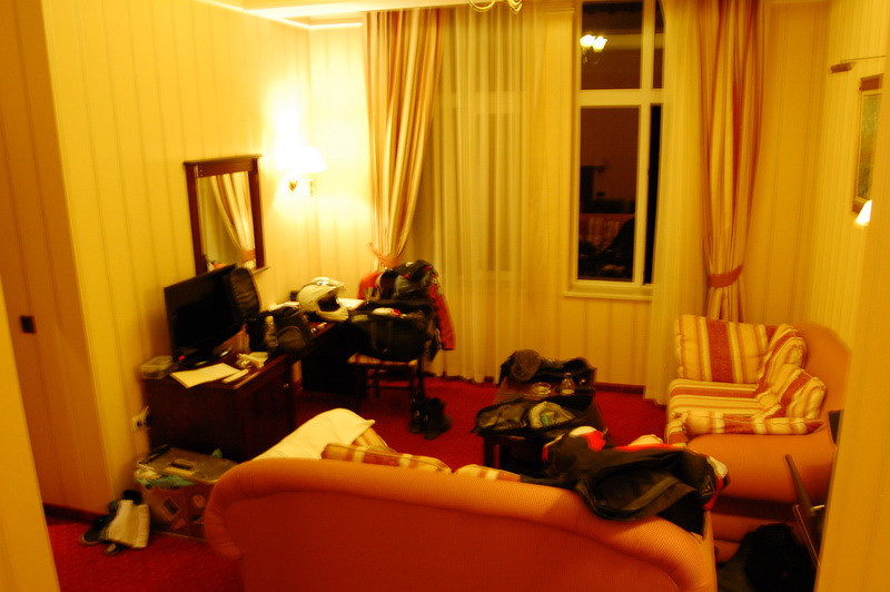 Abgestiegen sind wir in einem **** Hotel, Wolfi setzte sich durch ((und zahlte dafuer das Abendessen)). WLAN bricht alle paar Minuten ab, die Klimaanlage rennt auf Hochtouren und schafft es den Raum auf 30° zu halten, wahrend es draussen endlich unter 25° hat. Aber ich will nicht klagen, es ist sauber und gross und es gibt einen bewachten Parkplatz fuer die Moppeds, der angeblich ((laut Guide)) notwendig ist. Meine Prellung und das daraus resultierende Haematom nimmt abenteuerliche Formen an und erstreckt sich nun ueber die Schulter und die Brust in schillernden Farben. Noch wird es nicht besser. Mal sehen was das noch wird.
