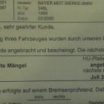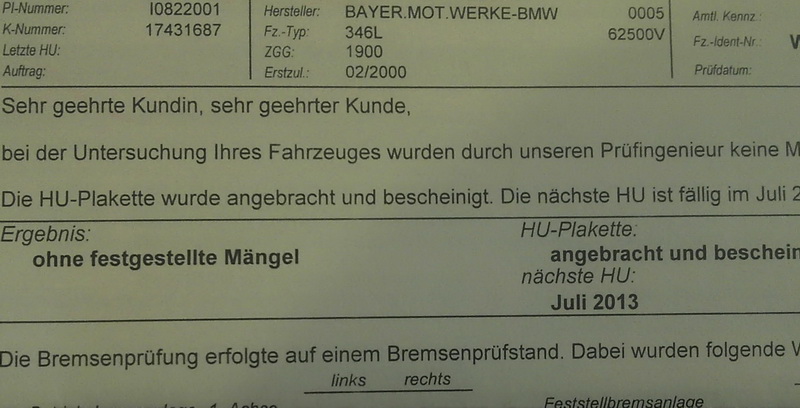 Keine 5 min Waertezeit, dann bin ich schon dran. Der Pruefomat studiert die Maengel auf dem Pruefbericht und faehrt erst auf den Rollepruefstand um die nun ordentlich werkende Bremse abzuhaken und dann auf die Buehne. Nein .. ausgebautes Teil ist uninteressant, einen Mangel, der beseitigt wurde, muss der rechtschaffene Pruefer selber begutachten. Mit einer kleinen Lampe leuchtet er vor dem Wagen stehend ein wenig in Richtung Spurstange und das wars. Ich habe es vermieden, dem eifrigen Gesellen mitzuteilen, das die Antriebsachse bei BMW in aller Regel hinten zu finden ist und die Manschette nur sichtbar ist, wenn man unter dem Wagen steht. -.-