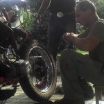 Von der kleinen Werkstatthalle bis 10 km vor dem Ziel lief auch alles wie geschmiert. Von der blauen Rauchsaeule, die ((zumindest aus dem linken Auspuff)) weithin sichtbar emporstieg, mal abgesehen. An einer kleinen Kreuzung zwischen weissnichmehr und wogehtslang wird das Gespann immer langsamer. Ich wende und hoffe es wird hier Rauchpause oder grosses Palaver geben, muss aber erfahren, die Olga zuendet nur noch auf einer Titte. Dann geht sie ganz aus. Grosses Staunen. Es werden Kerzenschluessel gesucht, nur die falshce Groesse gefunden, vermittels sanfter Gewalt die Kerze doch noch entfernt … ein Kerzenbild wie gemalt zu Tage gefoerdert .. geraetselt. Ein Motor, vor allem wenn nach Bauplaenen von 1940 gebaut, ist nun keine Raketenwissenschaft. Es bedarf eines Gemisches aus Luft und Sprit und zum Zeitpunkt der Verdichtung einen Funken. Dann macht es BUMM und das ganze wiederholt sich. Die „Reparatur“ bestand in diesem Fall darin, die Karre zur 500 Meter entfernten Tankstelle zu schieben.