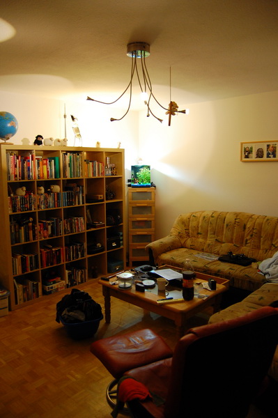 So sitzen wir nun in einer gemuetlichen 3 Zimmer Wohnung mit Blick ueber den Ort ((7. OG)), sind nur noch 100 Meter von der Tiefgarage entfernt ((statt vorher 500 Meter)) und sind froh den Zinnober hinter uns zu haben. Wohnung +1 Zimmer und gut 20qm mehr und die Maschinenbaeuerin hat sich eine neue Kueche gegoennt. Aber dafuer eben nun einen Keller wie ein Schuhkarton. Die Sperrmuellpresse hatte heute reichlich zu tun auf dem Bauhof. So radikal habe ich lange nicht ausgemistet.