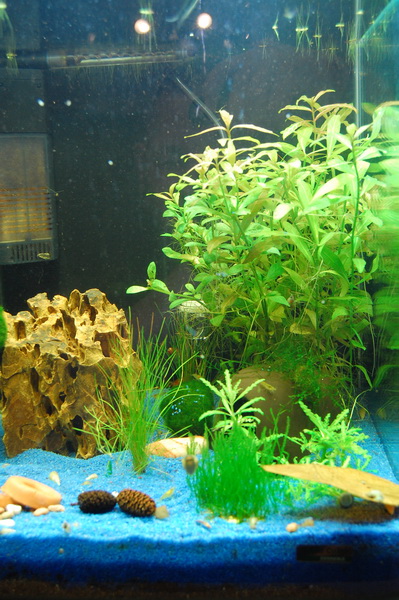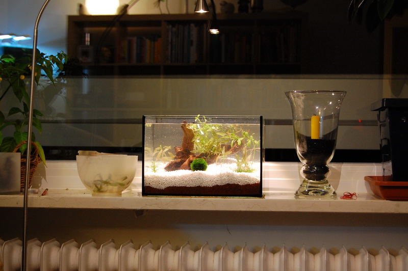 Also „rumgucken“ im Zooladen. Leider fand ich nicht auf Anhieb etwas sinnvolles ((zumal ich nicht wusste, wonach ich eigentlich suche)) und habe ein 10 Liter Becken und Bodengrund nebst Kies gekauft. Wozu? Keine Ahnung. Gefiel mir einfach. Da stand ich also wieder im Wohnzimmer und raetselte, wie die Wasserwerte stabil gehalten werden koennen und vielleicht auch das Pflanzenwachstum angeregt werden kann.