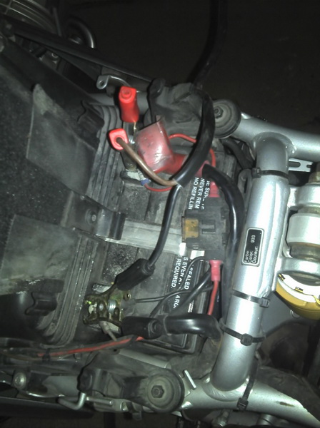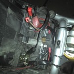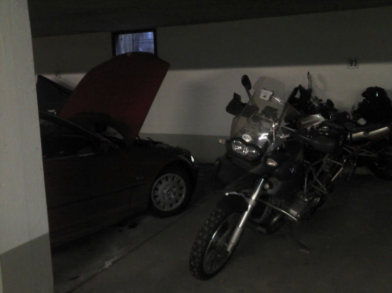 Bei der Gelegenheit verfluche ich gleich mal die 1200er fuer die Tatsache, dass die Kiste auch beim blossen rumstehen Saft zieht und jedesmal, wenn die Kiste laenger als 2 Monate rumsteht, die Bakterie geladen oder wie in diesem Fall, fremdgestartet werden muss. Dafuer habe ich ja mein selber gebasteltes Ueberbruckungskabel, klein, leicht, praktisch. Unpraktisch wenn man es erst holen muss weil man meinte „dieses eine Mal wird die Scheisskarre wohl anspringen“. Denkste. Dabei ist die nicht mal 2 Jahre alt ((oder habe ich zwischendrin noch eine gekauft und vergessen?))