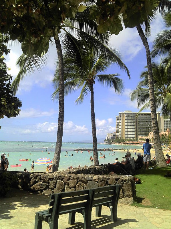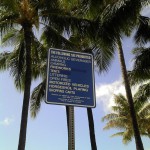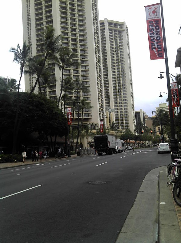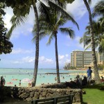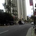 Am naechsten Morgen, nach einem leckeren Fruehstueck wird man wieder zum Flughafen chauffiert und nach nur 5h Flug ist man am Honolulu Airport ((HNL)) auf der Insel Oahu. Kaum aus dem Flieger kriegt man quasi ein Fressbrett verpasst, dass man rueckwaerts wieder in die Lobby fliegt. Von etwa 5°C in Muenchen und auch San Francisco, kommt man in tropische 25°C bei bewoelktem Himmel. Das man in HNL nicht einfach in ein Taxi steigen darf, lernen wir auf die harte Tour. Der Taxler sagt noch „wenn der Securitymann fragt, ihr habt mich angerufen“ und prompt stuerzt der Wachmann vor das Taxi und versucht die Abfahrt zu verhindern. Der Taxler haut den Gang rein, taeuscht rechts an und knallt dann links an dem Seppel vorbei. Geschossen wurde nicht. -.-